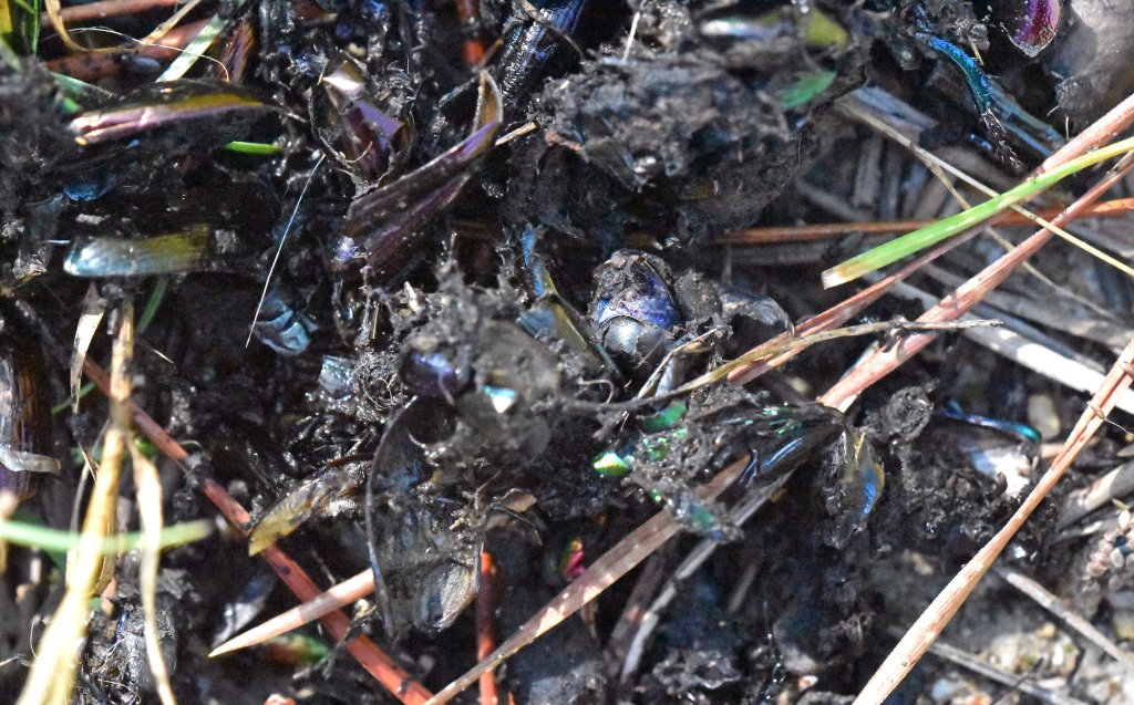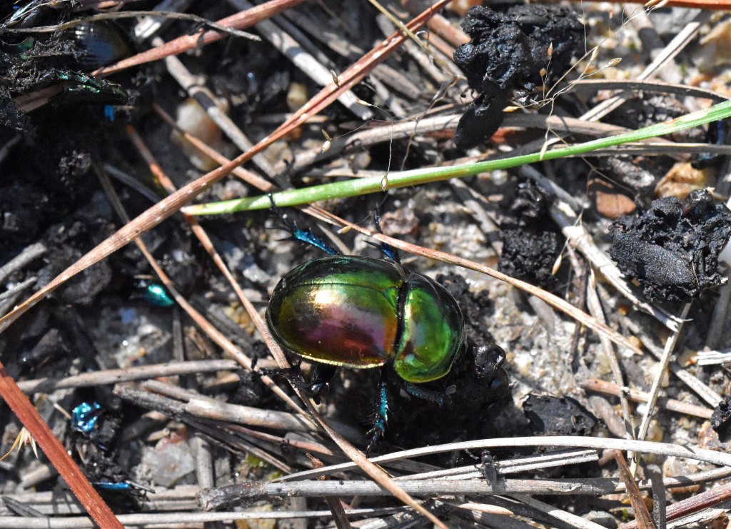 As well as seeing dung beetles, I also came across some spoor, or dung. The dropping was so full of beetle remains – shiny wing cases (elytra) and dismembered legs (below) – that for a moment I thought they were living beetles!