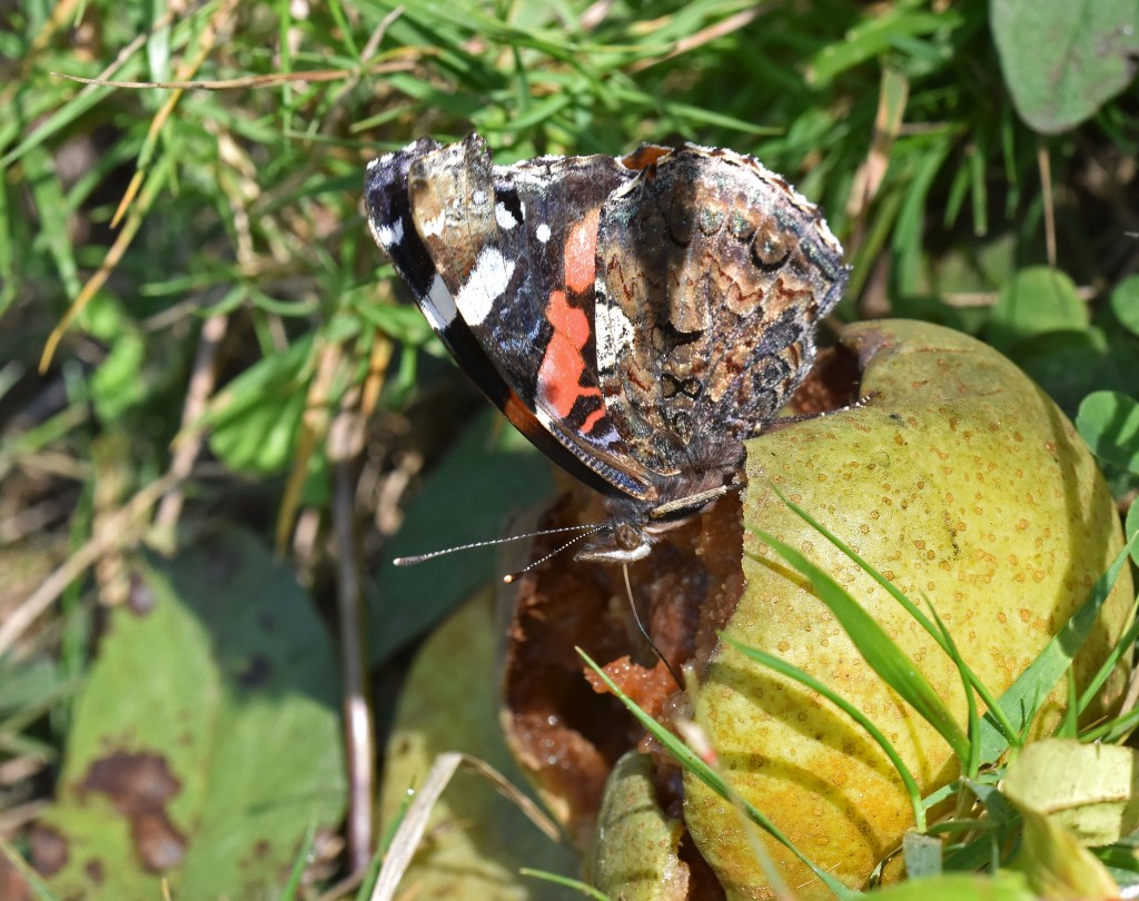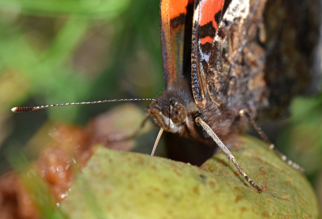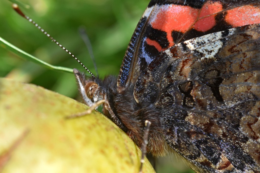 The drunken butterflies I came across were feeding on apples, not Californian wine! We are all partial to a little tipple, and if the alcohol comes in a cocktail packed full of sugars and other fruity goodies, so much the better! What convinced me that these particular butterflies were inebriated, or at least a bit tipsy, was that they were seemingly oblivious to my presence. Butterflies will normally fly off if you approach too closely; but these individuals showed no sign of moving, and it was possible to lie down in the grass beside them and stick a lens right up to them! This behaviour would seem to be highly maladaptive: putting them at risk of predation. Whether it was the delight of fermenting apple juice that kept them glued to their apples, or a sense of fearlessness and bravado that comes with intoxication, I can’t be sure!