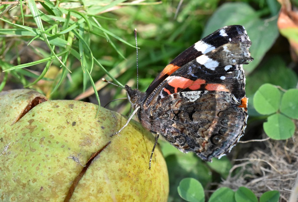 I have blogged before about Red Admirals feeding on fallen apples, but I cannot resist revisiting the subject, not only to share some more photographs, but also to touch on the subject of inebriation in butterflies! There are many species which feed on fallen fruits and have no doubt become intoxicated, but I came across a case of an entomologist deliberately giving a butterfly alcohol, and observing the behaviour of the drunken lepidopteran! The account, reported in the Journal of the Lepidopterists’ Society, is worth quoting in full! See below.