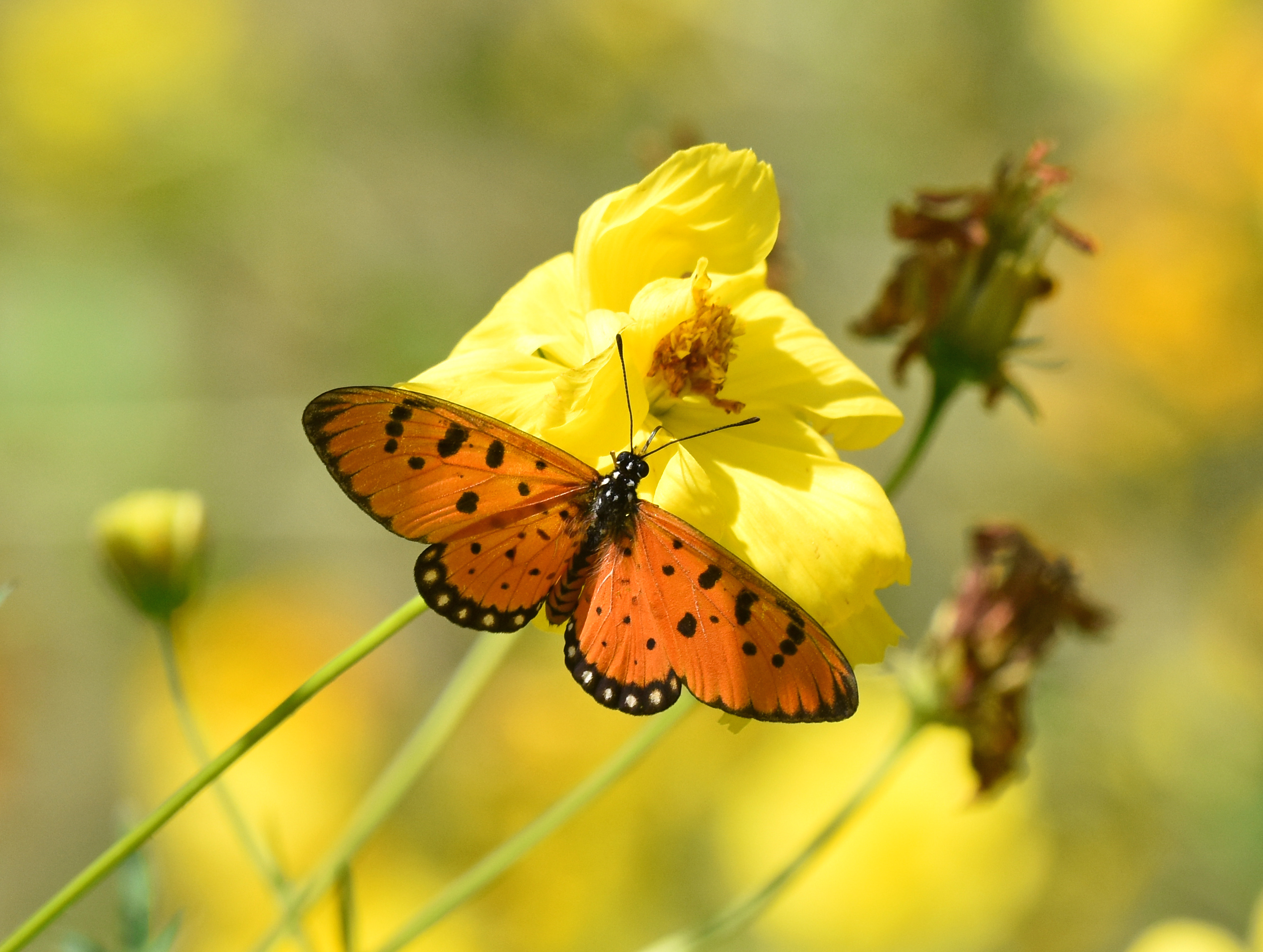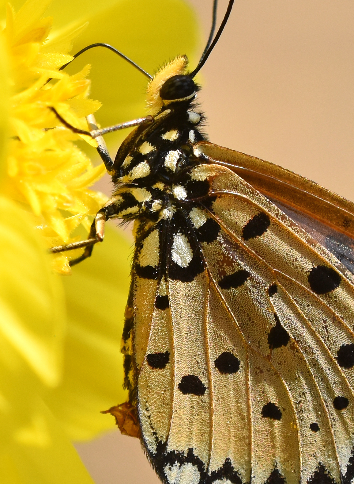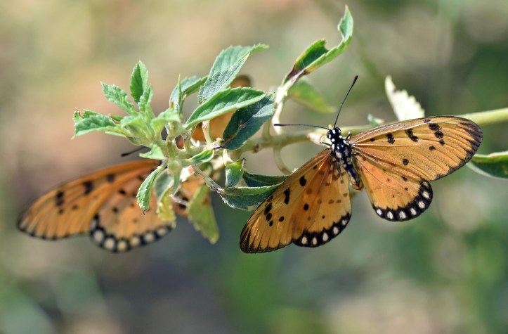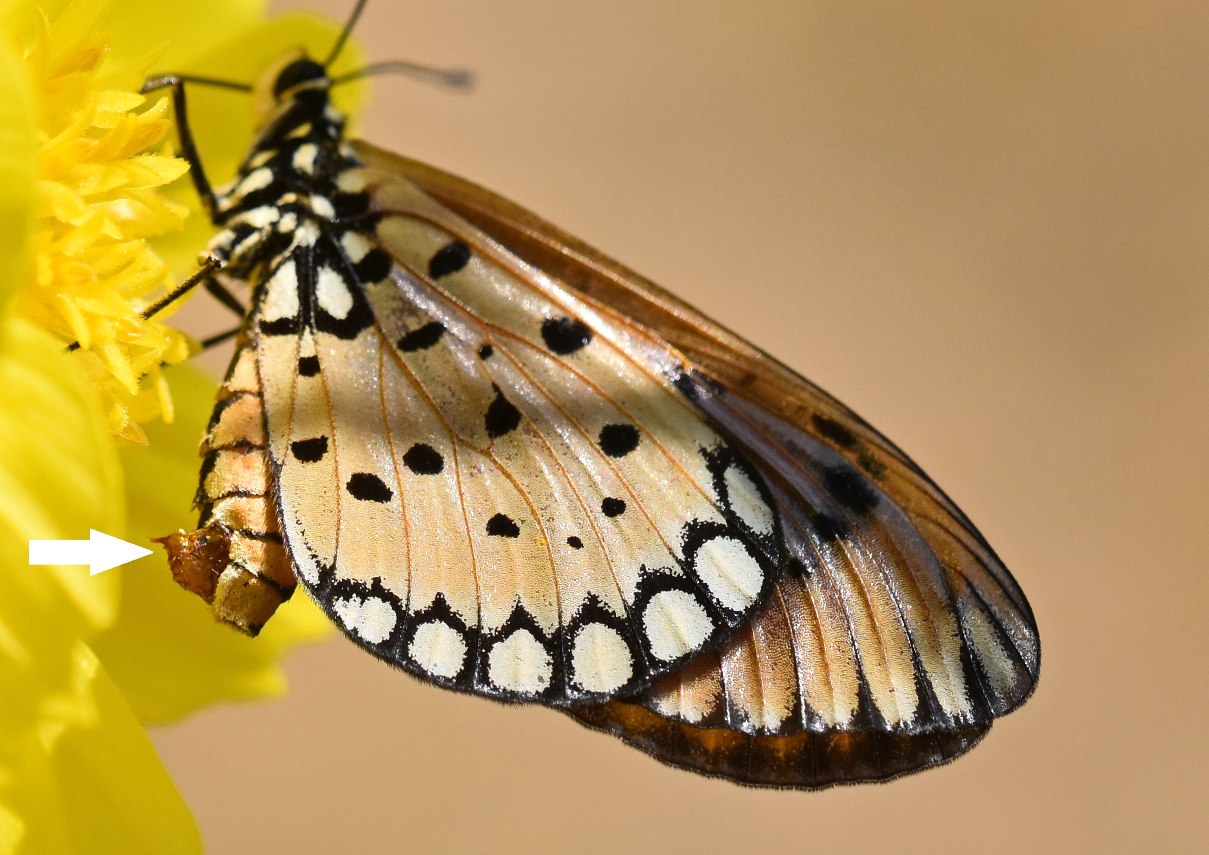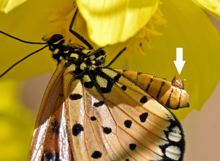 The evolution of mating plugs is thought to have occurred as a result of intense sexual competition between males, and there are often conflicts between males and females in these species. I did not actually witness any mating in this species, but in other Acraea species the males can be quite rough and engage in what is called ‘take-down’ behaviour: a forced copulation where the females are knocked down onto the ground! I wonder if anyone has witnessed copulation in Acraea terpsicore? It is not mentioned in this excellent account of the life history of the Tawny Coster.