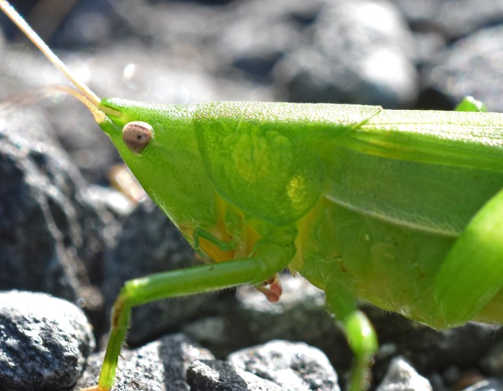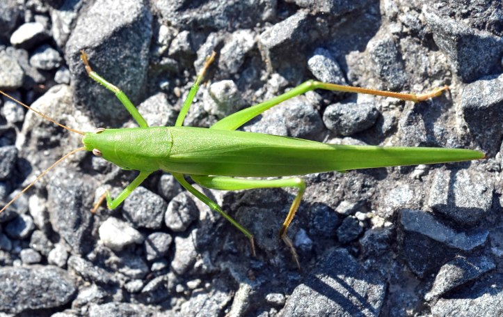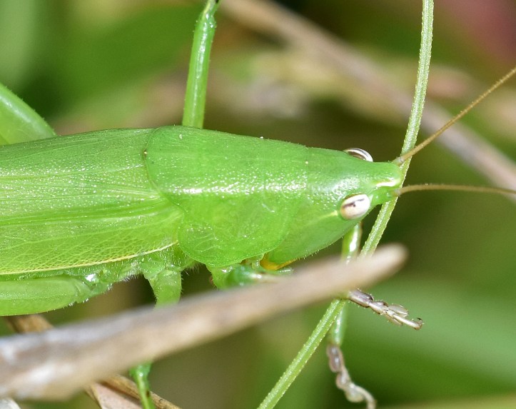 Ruspolia species all look very similar. According to one scientist, ‘many Ruspolia spp. have no apparent diagnostic features, and thus their taxonomy largely requires molecular evidence’ (Matojo & Hosea, 2013). Which is not much use to a field biologist! There are over forty Ruspolia species listed on Wikipedia, but there must be many more which are unknown or undescribed.. Apparently, they all have a yellow ‘jaw’ base, which can be seen in the following photograph I took in Spain (below).