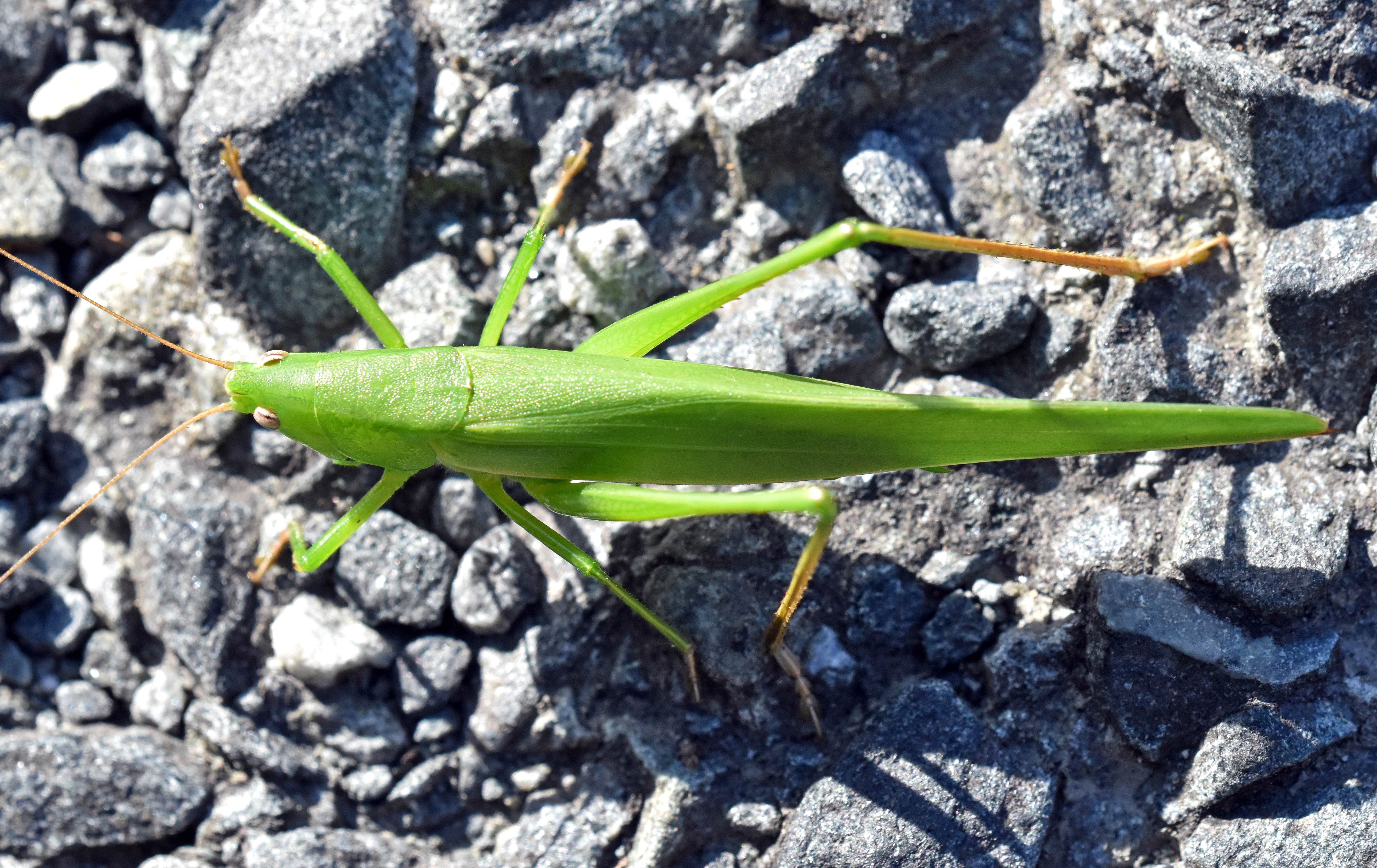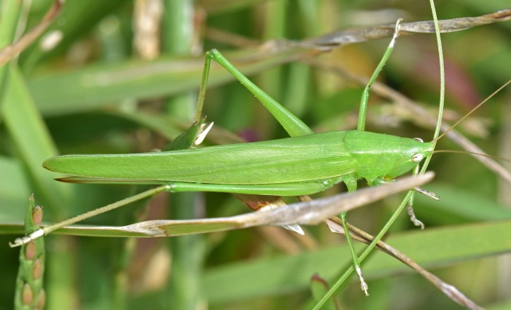 Coneheads (Conocephalinae) are not particularly common in the UK – there are three species in southern England – but head south, and they start to get much more abundant. In many tropical and sub-tropical areas, they become extremely abundant and can be a severe pest, damaging a wide range of cultivated plants. Indeed, some Ruspolia coneheads, discussed here, can form huge aggregations, and like plagues of locusts, they can travel long distances (mostly at night it seems) before descending to feed on some poor farmer’s crops. In many parts of Africa however, people have taken advantage of their abundance and harvest them as a source of food.