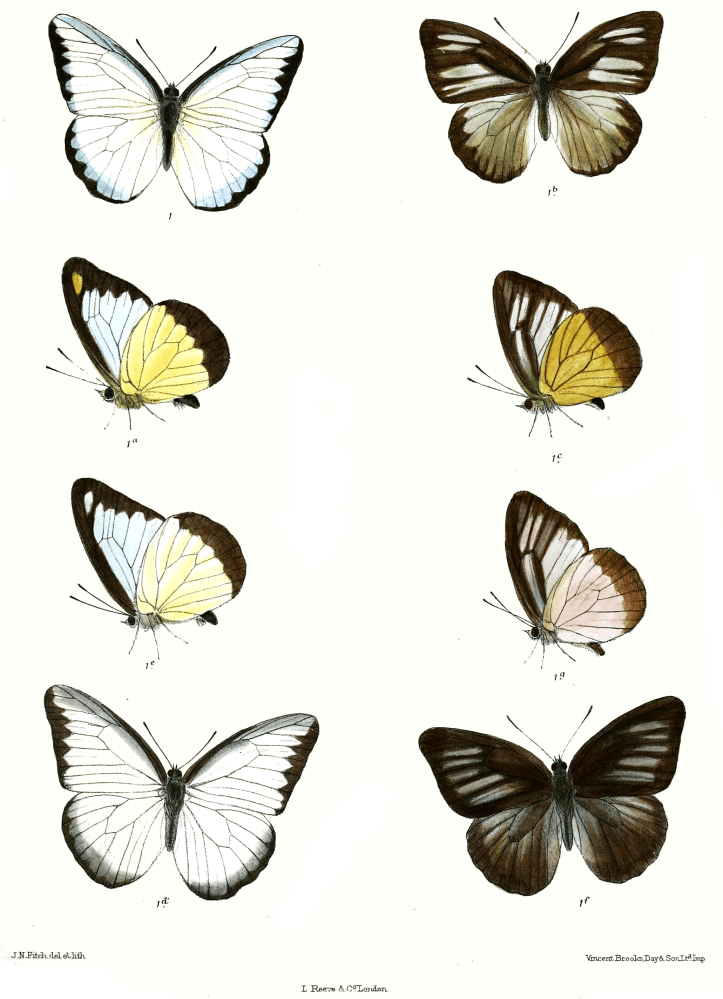 Appias hippoides (=lyncida) from Frederic C. Moore (1903-05), Lepidoptera Indica. Plate 540, Vol. 6. Males on left, females on right. Top: Wet season brood. Bottom: Intermediate Wet Season brood.