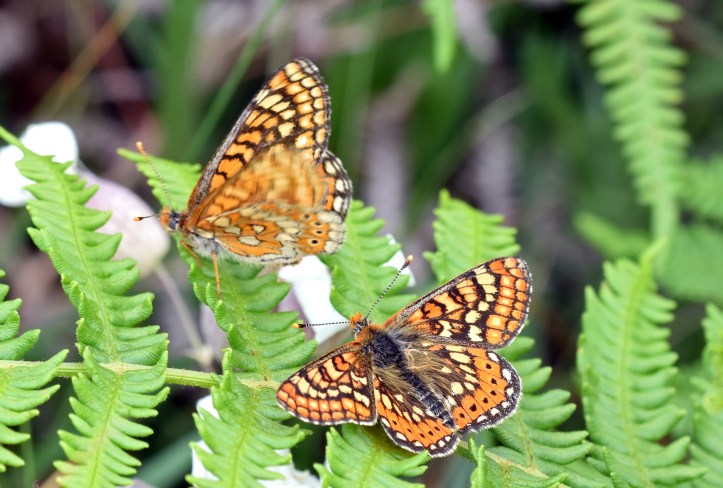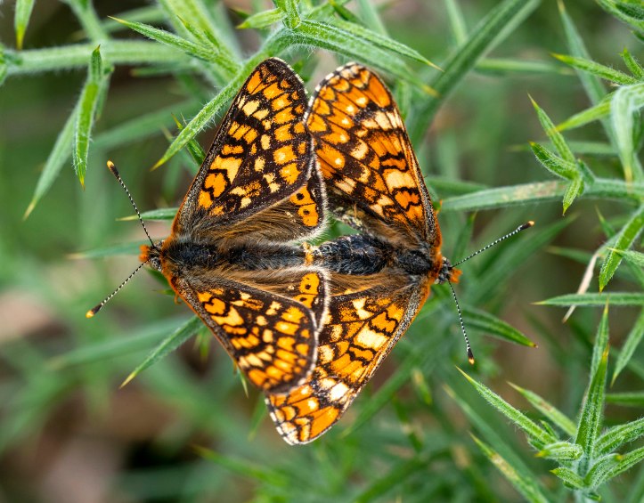Courtship in Euphydryas species is often very brief, or virtually non-existent (Cannon, 2019) and the Marsh fritillary is no exception. The variety of Marsh fritillary they studied is E. aurinia provincialis (Nymphalidae) of the Italian region Latium. Their work has revealed a surprising wealth of information about the courtship and mating of these butterflies, as a result of painstaking observations and investigations. For example, they analysed over 24 hours of video recordings, cataloging the courtship and mating behaviour. I describe some of their results below. I think it almost certain that their findings apply to all subspecies.