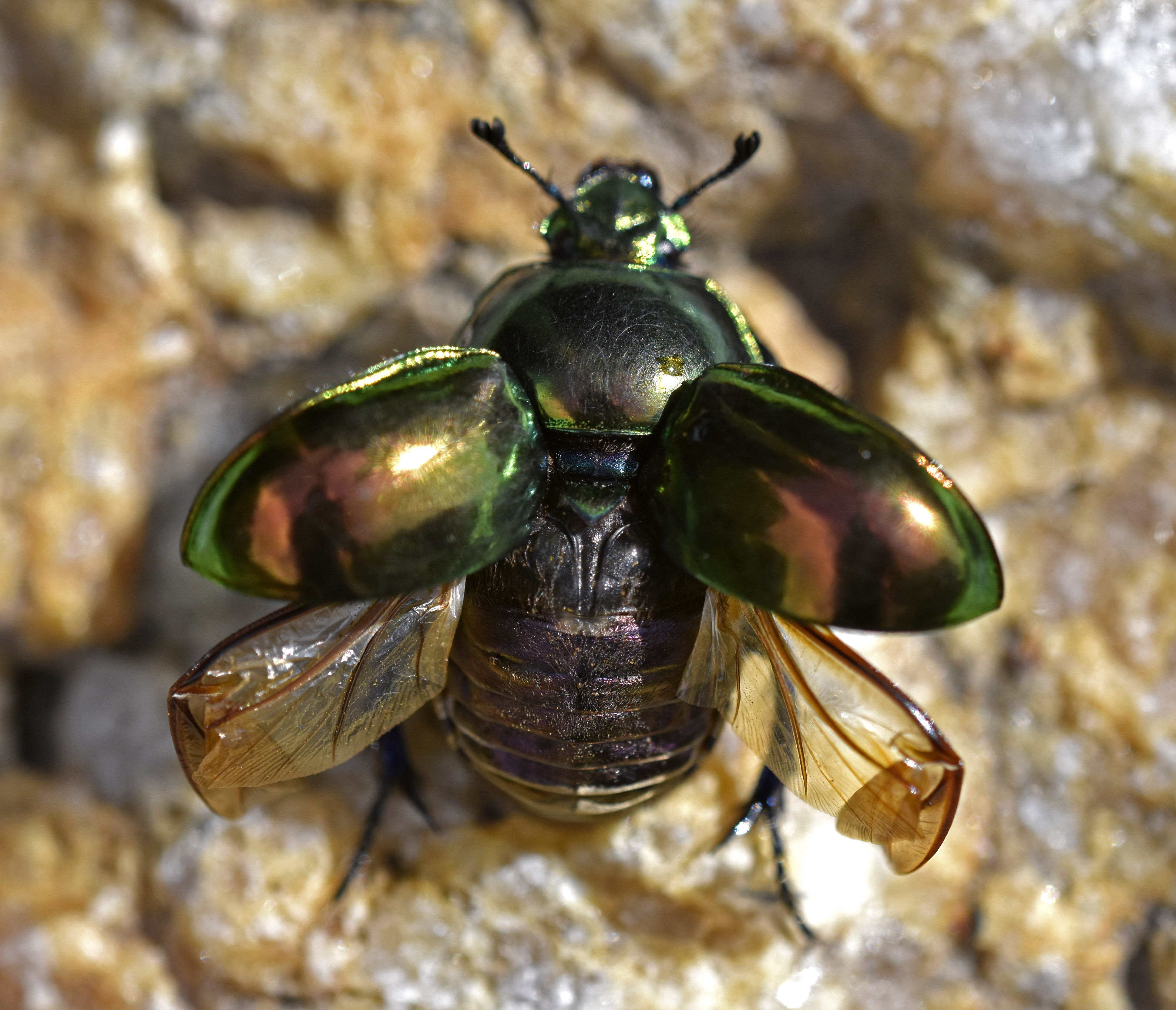 Dung beetle (Trypocopris [=Geotrupes] pyrenaeus var. coruscans) taking off with wings spread.