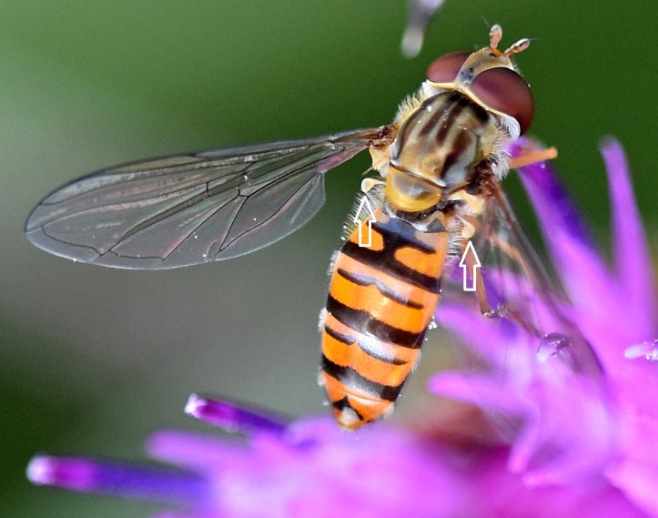 Hoverfly (Episyrphus balteatus) female showing halteres, UK. Photograph by Raymond JC Cannon