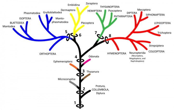 1. Each number represents a major change or group within the insects. All hexapods (hexapoda); 2. True insects; 3. Development of wings (pterygota); 4. Development of wing folding mechanism (neoptera); 5. Grasshopper-like, “Orthopteroid” insects, 6. Stonefly-like, “Plecopterida” insects; 7. Acercaria insects; 8. Endopterygota, insects with complete metamorphosis. https://wiki.bugwood.org/Insect_Orders2