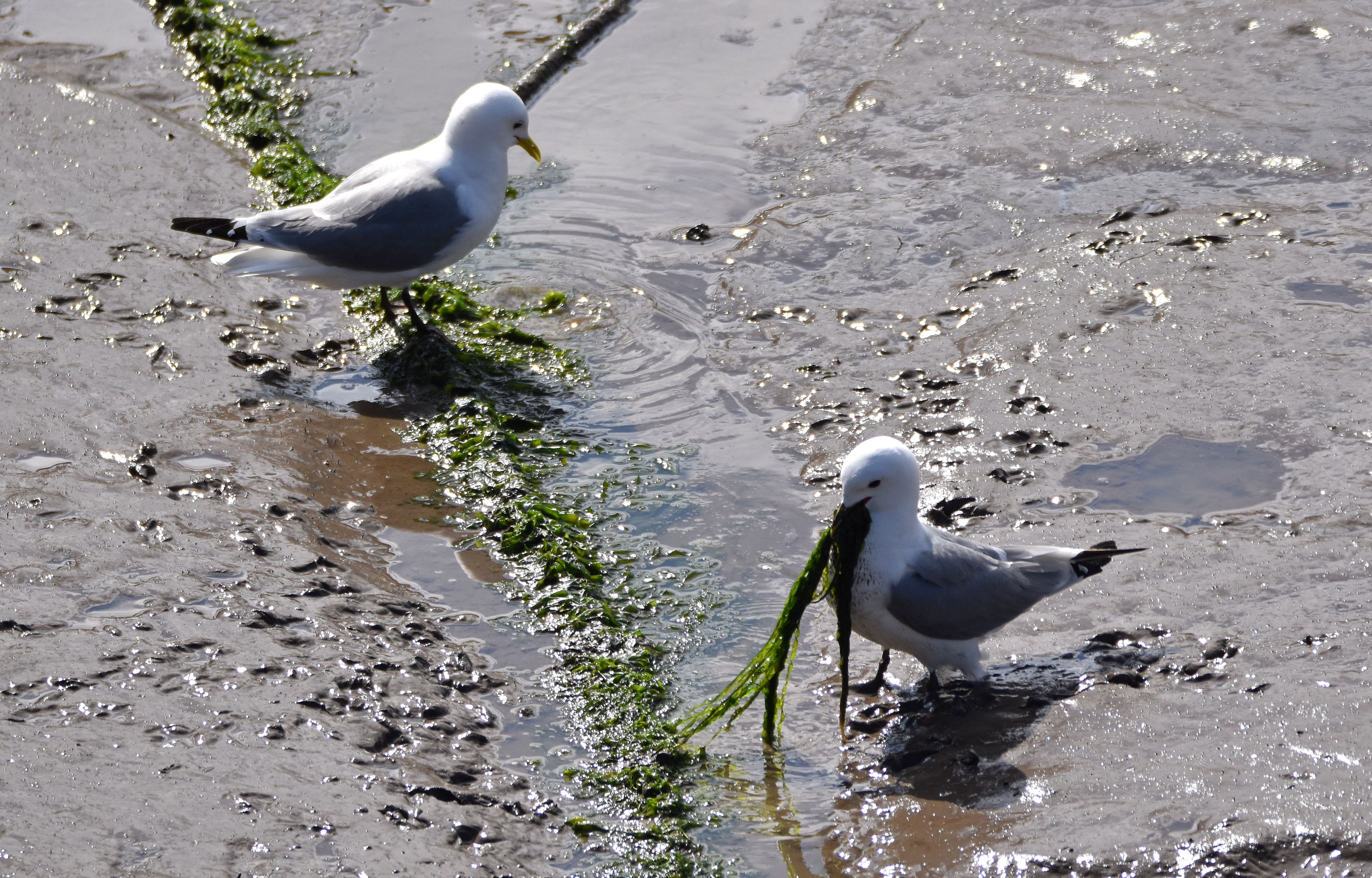 The gathering of mud, and especially seaweed, takes some skill, and kittiwakes probably take time to learn the art of gathering the right kind and size of material. Some were tugging at huge chunks (below).