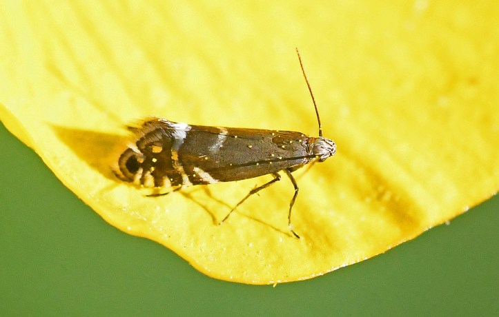 The species which I first went in search of was the Cocksfoot moth (Glyphipterix simpliciella) which I have come across before when photographing buttercups (below). I don’t know much about the biology of this tiny tiny (3 or 4mm long) moth and exactly what it does in buttercups other having a sip of nectar? They also seemed to be flying around a lot, so maybe buttercups are where they meet their friends and would-be lovers! Their larvae feed on other species, especially the grass cocksfoot (Dactylis glomerata).