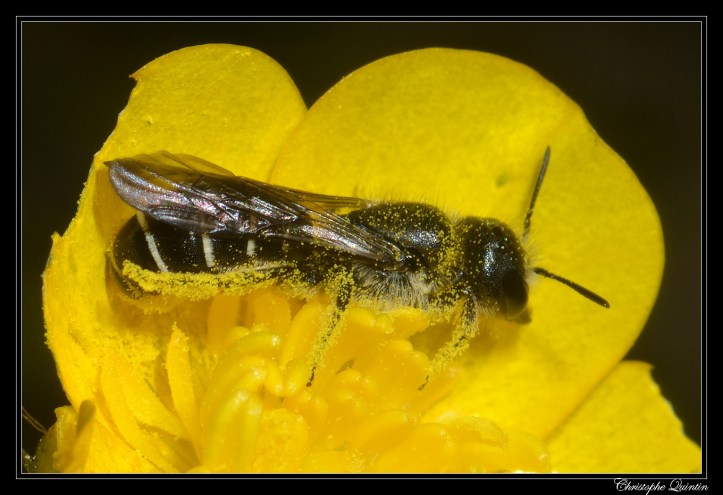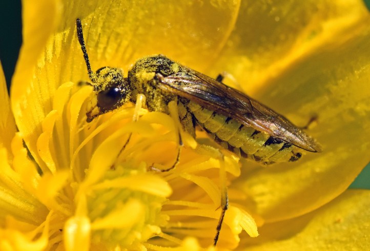 Unfortunately, one species I did not see on my buttercup visits was the Large scissor bee, also called the Sleepy Carpenter bee, Chelostoma florisomne (below). Probably too far north? These solitary bees (Megachilidae) are pollen-specialist (oligolectic) and are closely associated with the flowers of Ranunculus spp.. Unlike some other, more generalist (polylectic) bees, including honey bees, Chelostoma florisomne bees have a digestive system which can remove and absorb the toxins present in the buttercup pollen (Dobson & Peng, 1997). A diet of pollen from buttercup plants (Ranunculus) can have a deleterious effect on developing larvae of bees which not buttercup specialists (Sedivy et al., 2012). Bees like Chelostoma florisomne have also been observed “curled up around the base of the stamens of buttercups during poor weather, apparently relying on the closure of the petals to shelter them” (BWARS website).