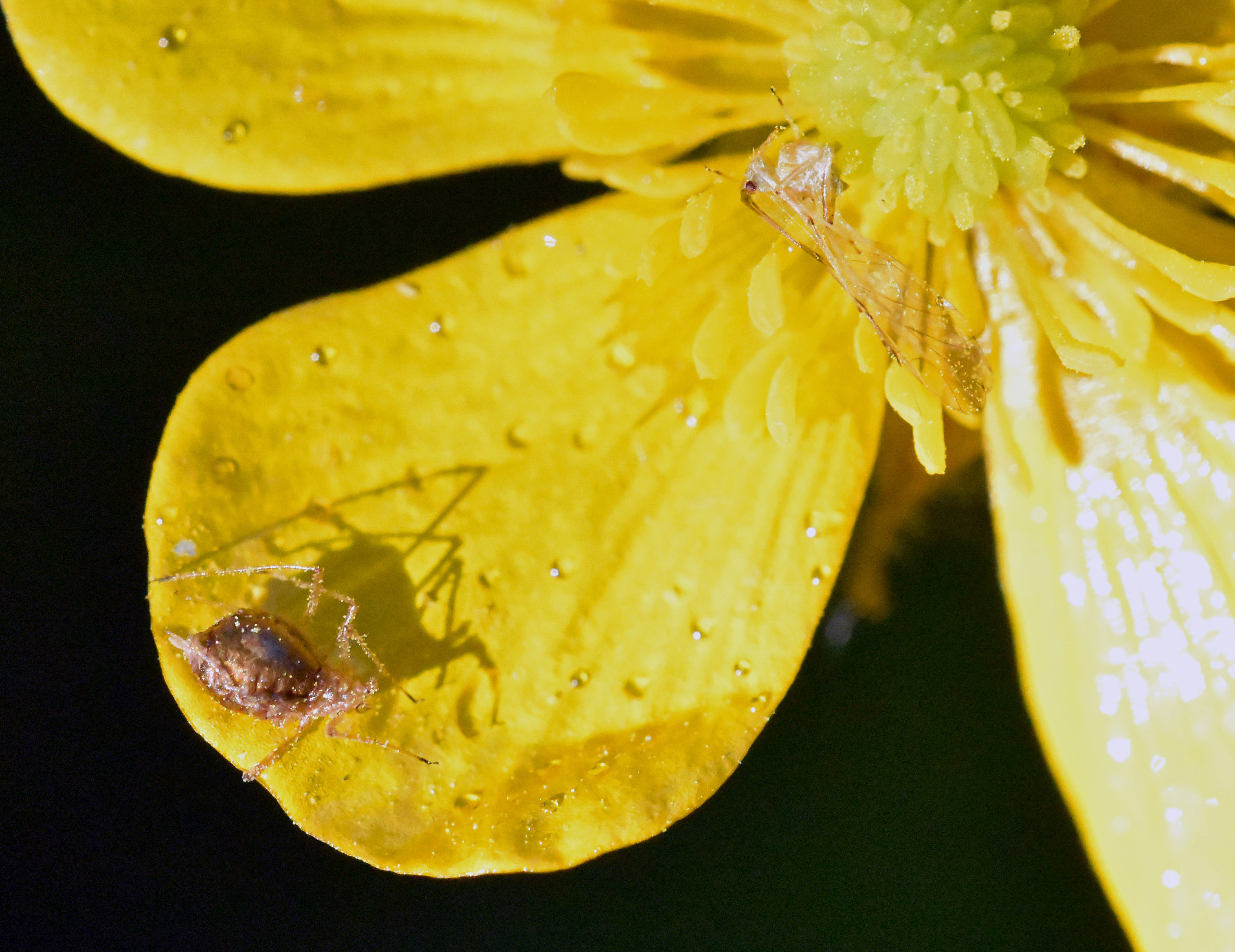I also came across a parasitised aphid on a buttercup petal (below). There are a number of aphid species which occur on Ranunculus species, perhaps a many as 14 in the UK (Blackman & Eastop, 2006) including some which use the roots or stems of buttercups as secondary plant hosts, i.e. during the summer. Aphids on buttercups include the gall forming poplar/buttercup aphid (Thecabius affinis) and the nice yellow buttercup aphid, Tubaphis ranunculina, which lives on the lower side of the leaves, sometimes moving to the upper side and the stems.