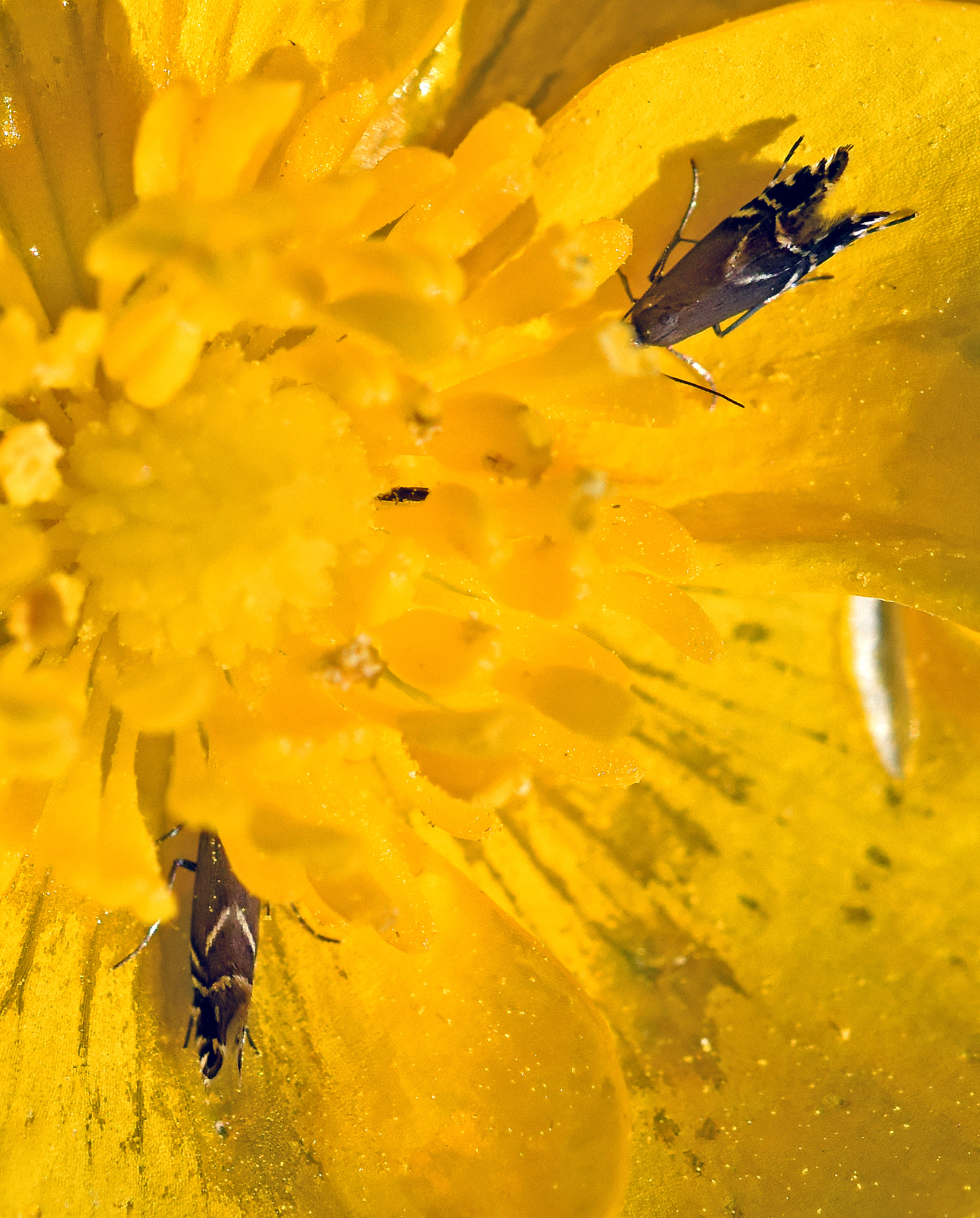 The species which I first went in search of was the Cocksfoot moth (Glyphipterix simpliciella) which I have come across before when photographing buttercups (below). I don’t know much about the biology of this tiny tiny (3 or 4mm long) moth and exactly what it does in buttercups other having a sip of nectar? They also seemed to be flying around a lot, so maybe buttercups are where they meet their friends and would-be lovers! Their larvae feed on other species, especially the grass cocksfoot (Dactylis glomerata).