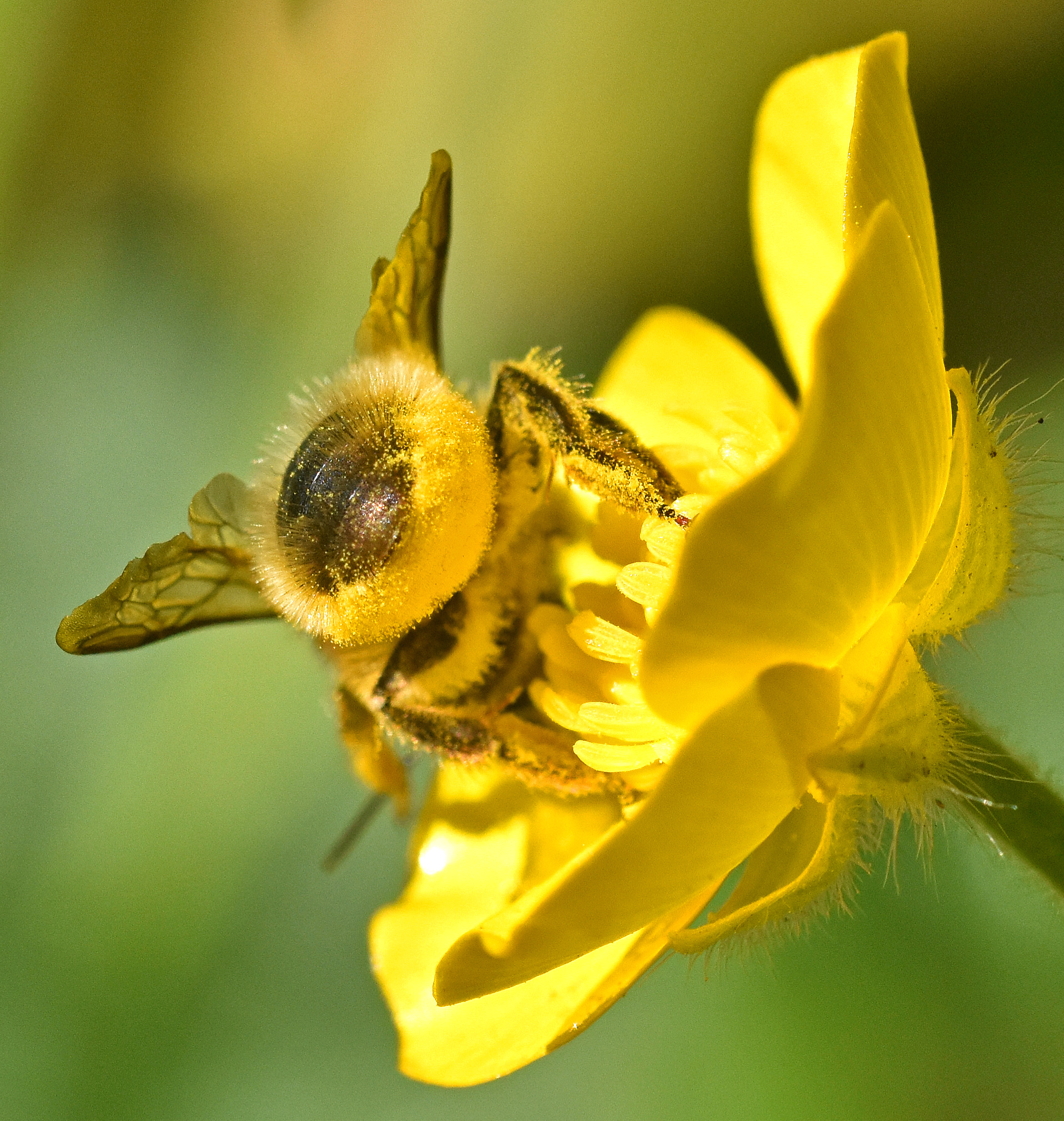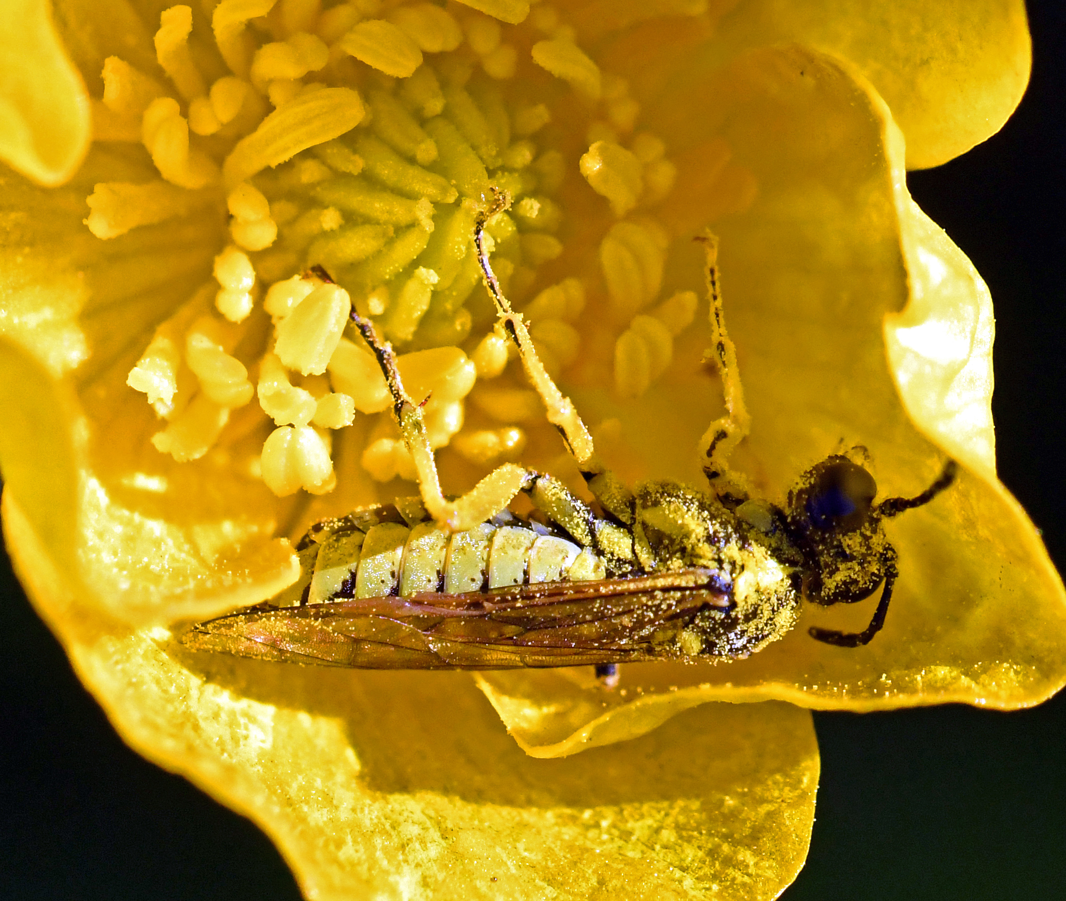 Unfortunately, one species I did not see on my buttercup visits was the Large scissor bee, also called the Sleepy Carpenter bee, Chelostoma florisomne (below). Probably too far north? These solitary bees (Megachilidae) are pollen-specialist (oligolectic) and are closely associated with the flowers of Ranunculus spp.. Unlike some other, more generalist (polylectic) bees, including honey bees, Chelostoma florisomne bees have a digestive system which can remove and absorb the toxins present in the buttercup pollen (Dobson & Peng, 1997). A diet of pollen from buttercup plants (Ranunculus) can have a deleterious effect on developing larvae of bees which not buttercup specialists (Sedivy et al., 2012). Bees like Chelostoma florisomne have also been observed “curled up around the base of the stamens of buttercups during poor weather, apparently relying on the closure of the petals to shelter them” (BWARS website).