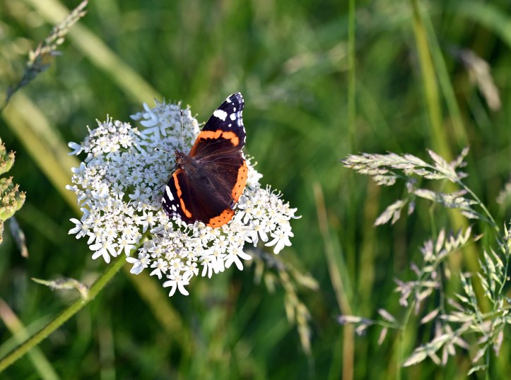 Red admiral perching on umbel head