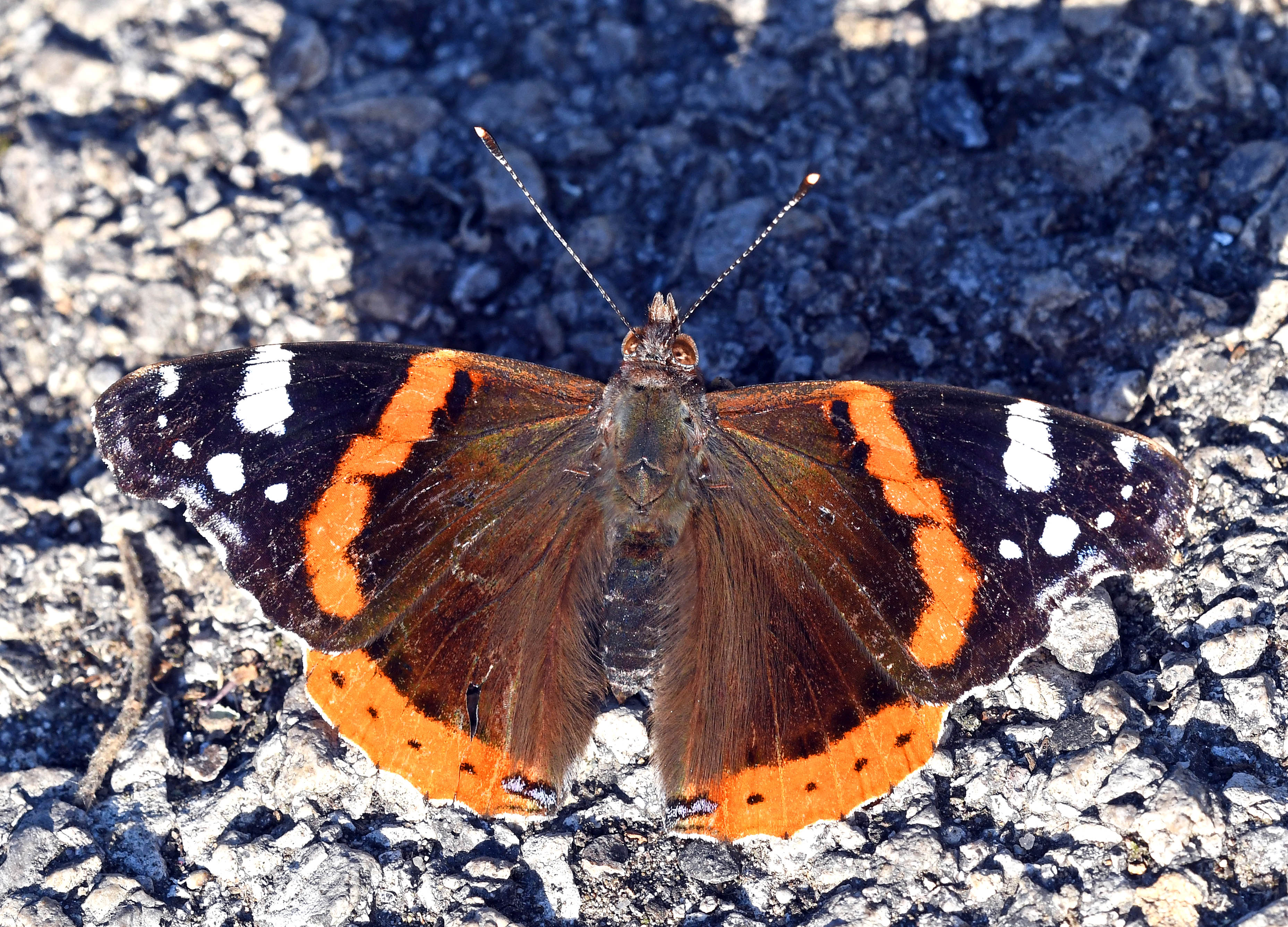 Red admiral (Vanessa atalanta) basking on pavement 25 June 20. Photograph by Dr Raymond JC Cannon