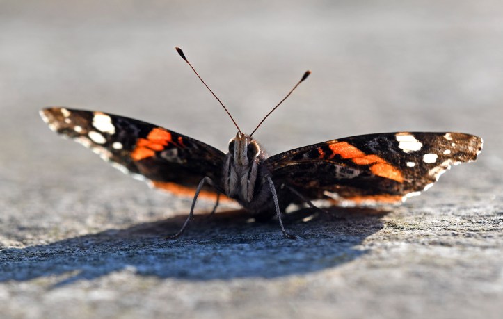 When I returned to the site the following day, same time, late afternoon c. 18:30, I had the distinct impression that the butterfly was not so ‘flighty’; not so wary. I suppose there is small chance that it was a different butterfly! Different individuals can lay claim to the same territory, and there were other Red admirals around, being chased out of the patch by the resident male. Anyway, whether it was because the temporary territory had changed ownership, or, as I like to think, the same individual had grown used to my presence – sitting on the wall – it was a lot more ‘confiding’. Confiding is a term used by bird watchers when a bird shows itself very well to onlooking, binocular-clutching, twitchers. Birds get habituated too!