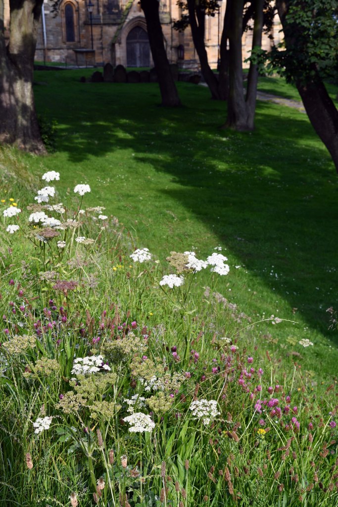 Red admiral, Vanessa atalanta, butterflies are notoriously territorial, particularly when they occupy their favoured spots in the late afternoon. I have been photographing one particular male this month (24-26 June 2020) which has commandeered a nice little bank of wild flowers in the grounds of a local church, St Mary’s, Scarborough. The butterfly’s territory is centred on a bank at the edge of the grounds, beside the road (below).