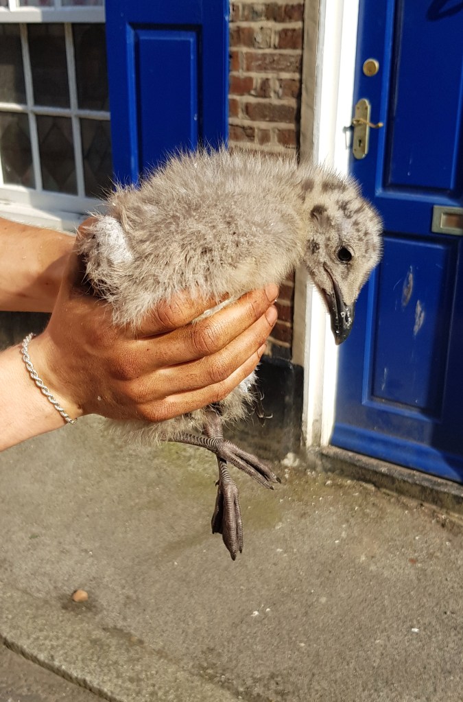 Herring gull chick which had fallen (or jumped) off a roof.