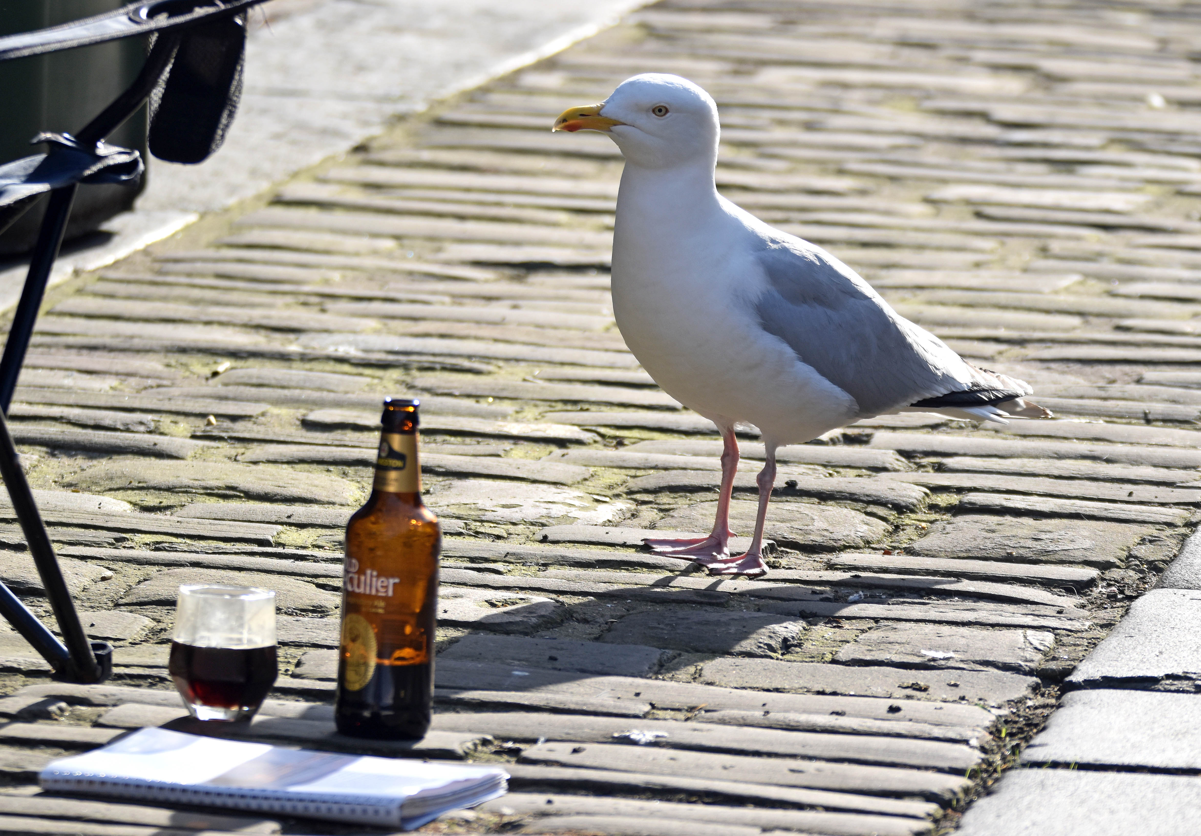 Herring Gull (Larus argentatus) adult looking at beer
