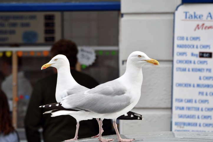 Herring Gull (Larus argentatus) adults outside chip shop