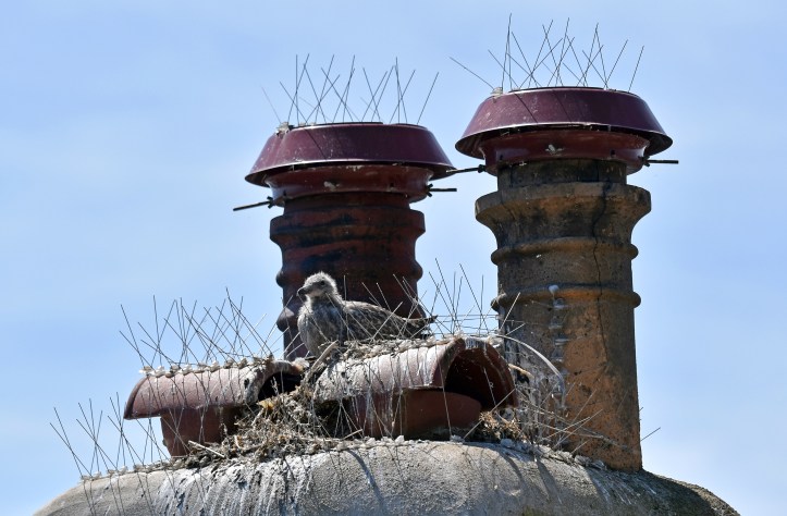 Herring Gull (Larus argentatus) chick on a roof surrounded by spikes. 1 July 2018  Scarborough