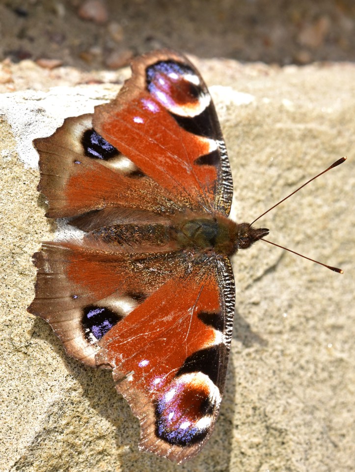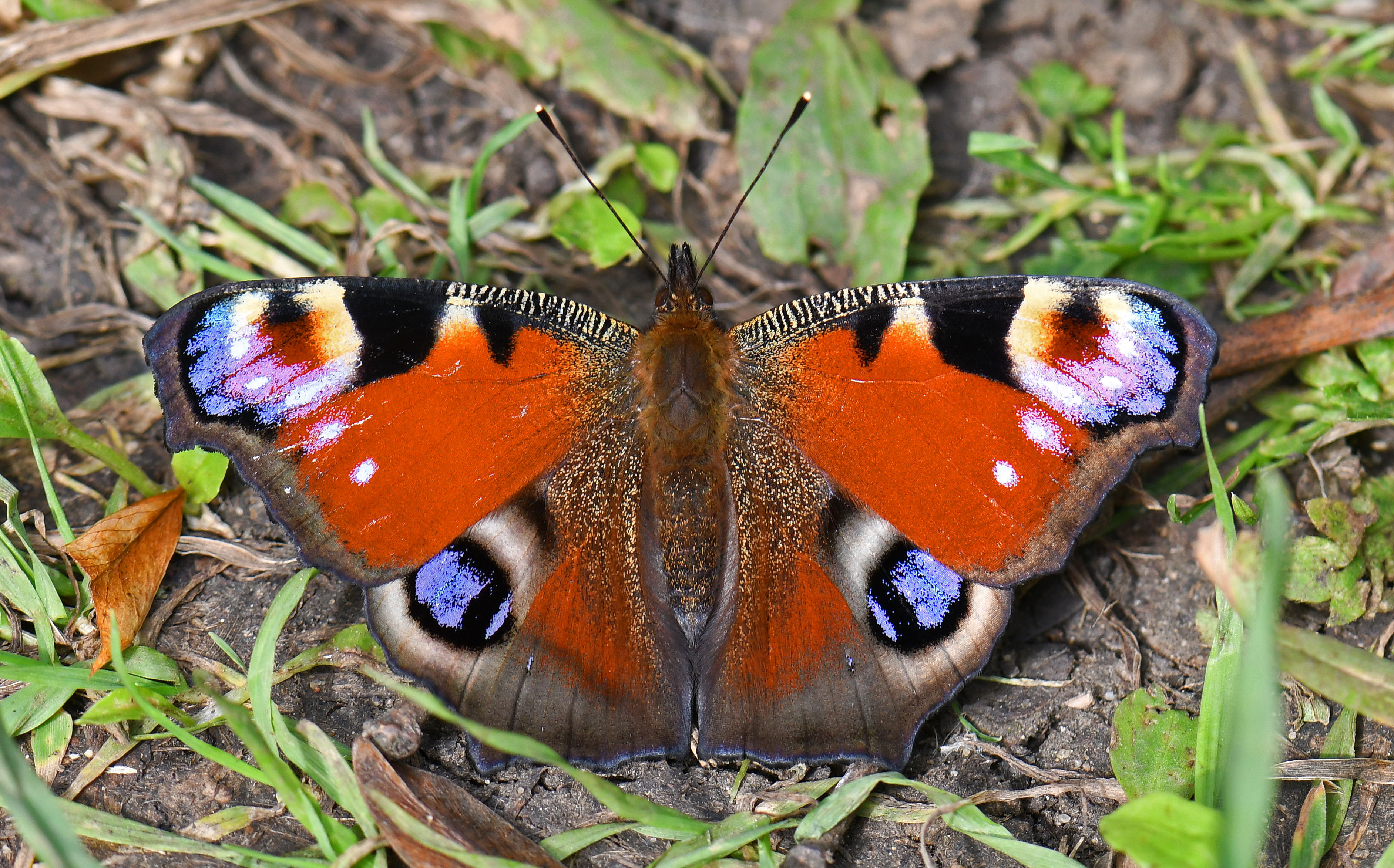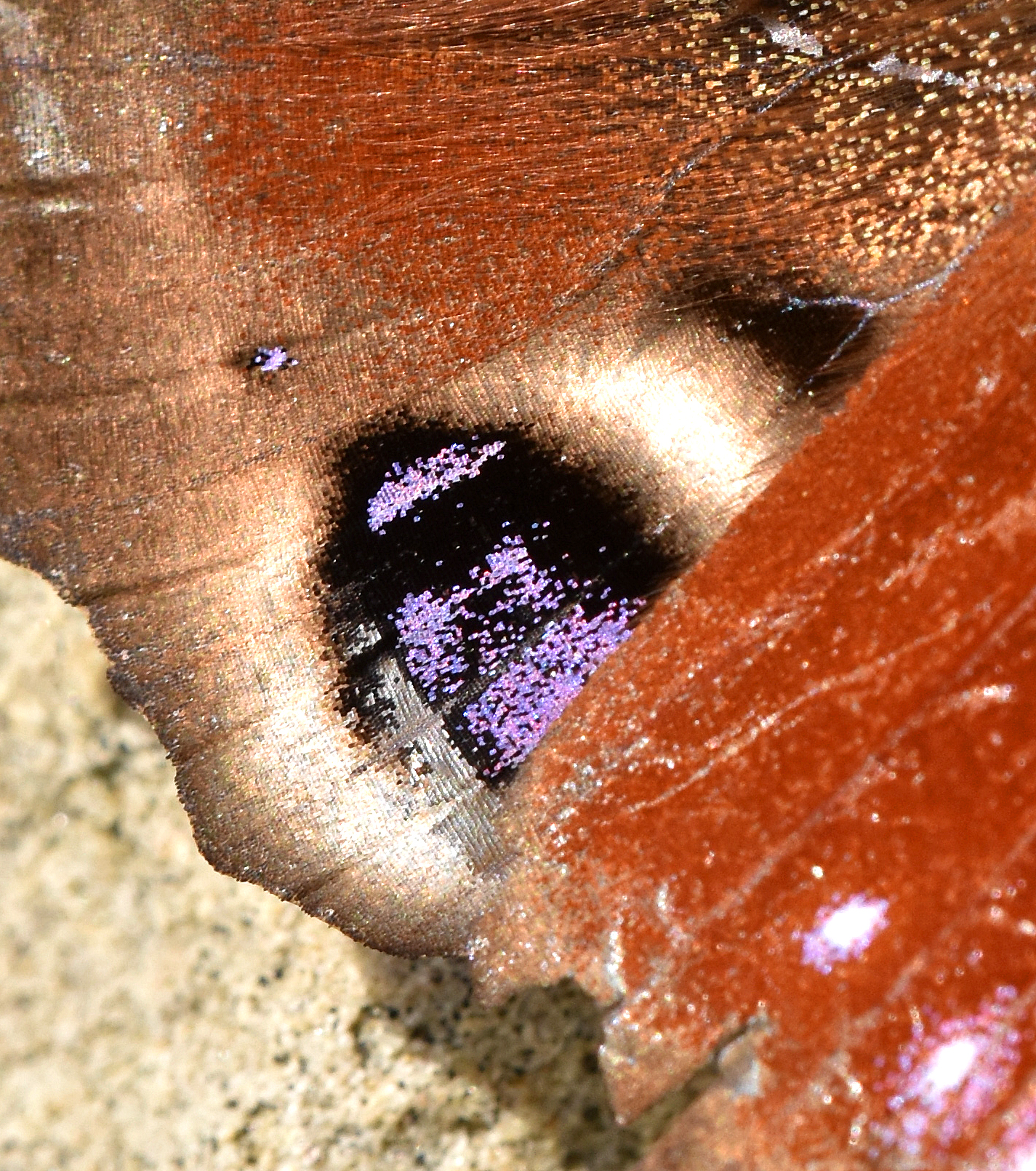 Despite having, no doubt, spent the winter hibernating somewhere, the beautiful violet scales on the hindwing eyespots (below) were still dazzling!