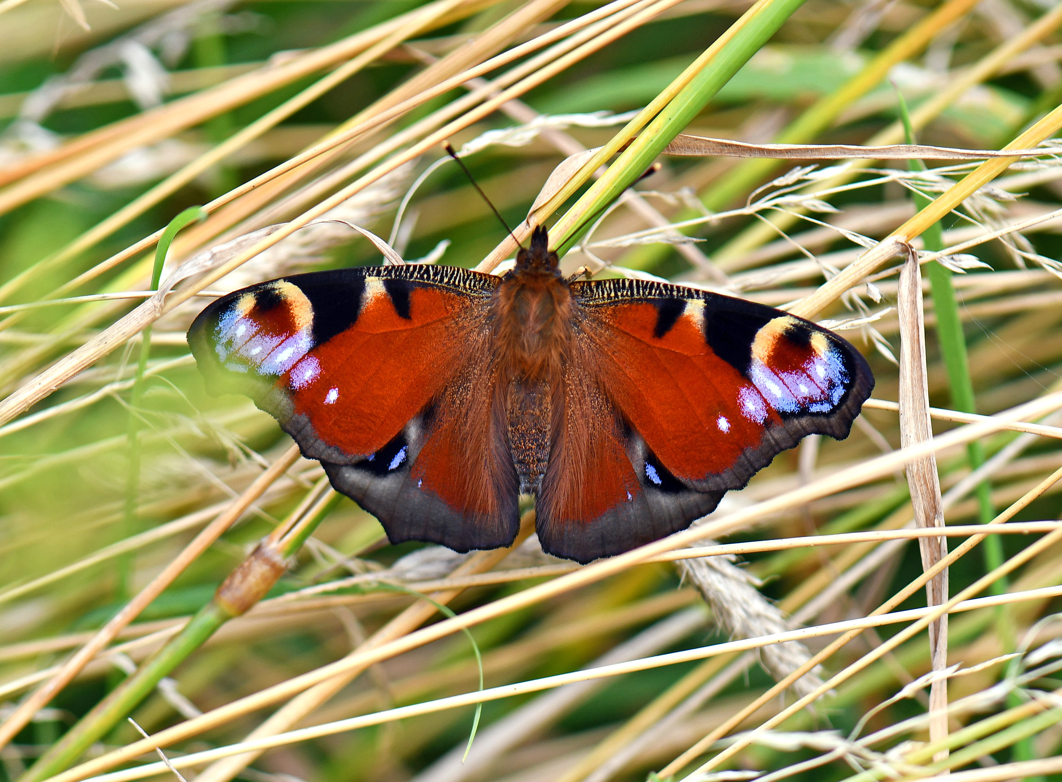 When temperatures drop, butterflies often hunker down in the vegetation, like this peacock I came across on a cool afternoon in a grassy field on Felmersham gravel pits SSSI, on 22 July 2020 (below).