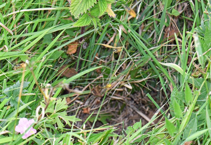When I first came across this wasp nest on 23 July, it was nicely hidden in the grass of a meadow (below). On this occasion I had camera with a 150mm macro lens, which meant that I could stand back a bit and take photographs without disturbing them too much.