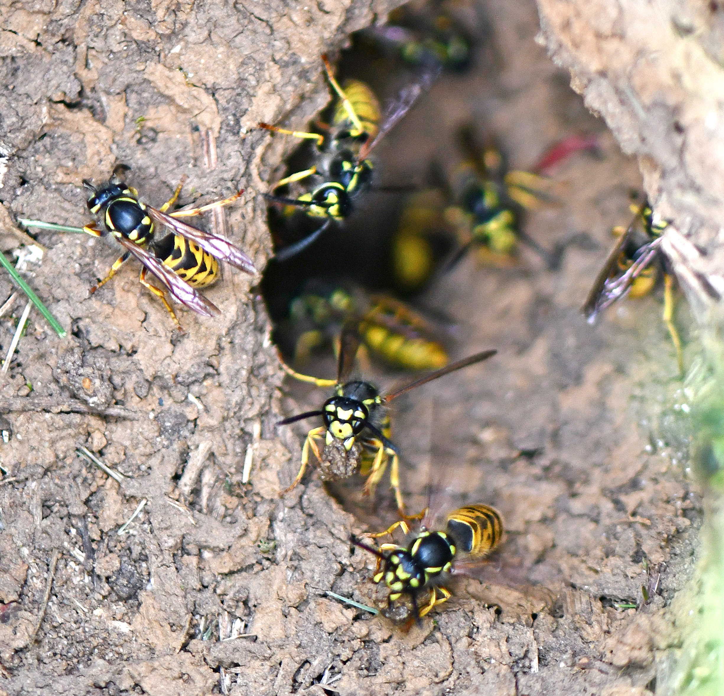 On my second visit, about a month later, the nest was much more exposed (below); perhaps dug out by a badger, someone suggested. Nevertheless, the wasps were still at work and reasonably peaceful as I started to take some pictures. However, on this occasion I only had my mobile phone with me, so I had to hold it much closer above the nest entrance than I had done so before. They put up with it for a while, but then they snapped!