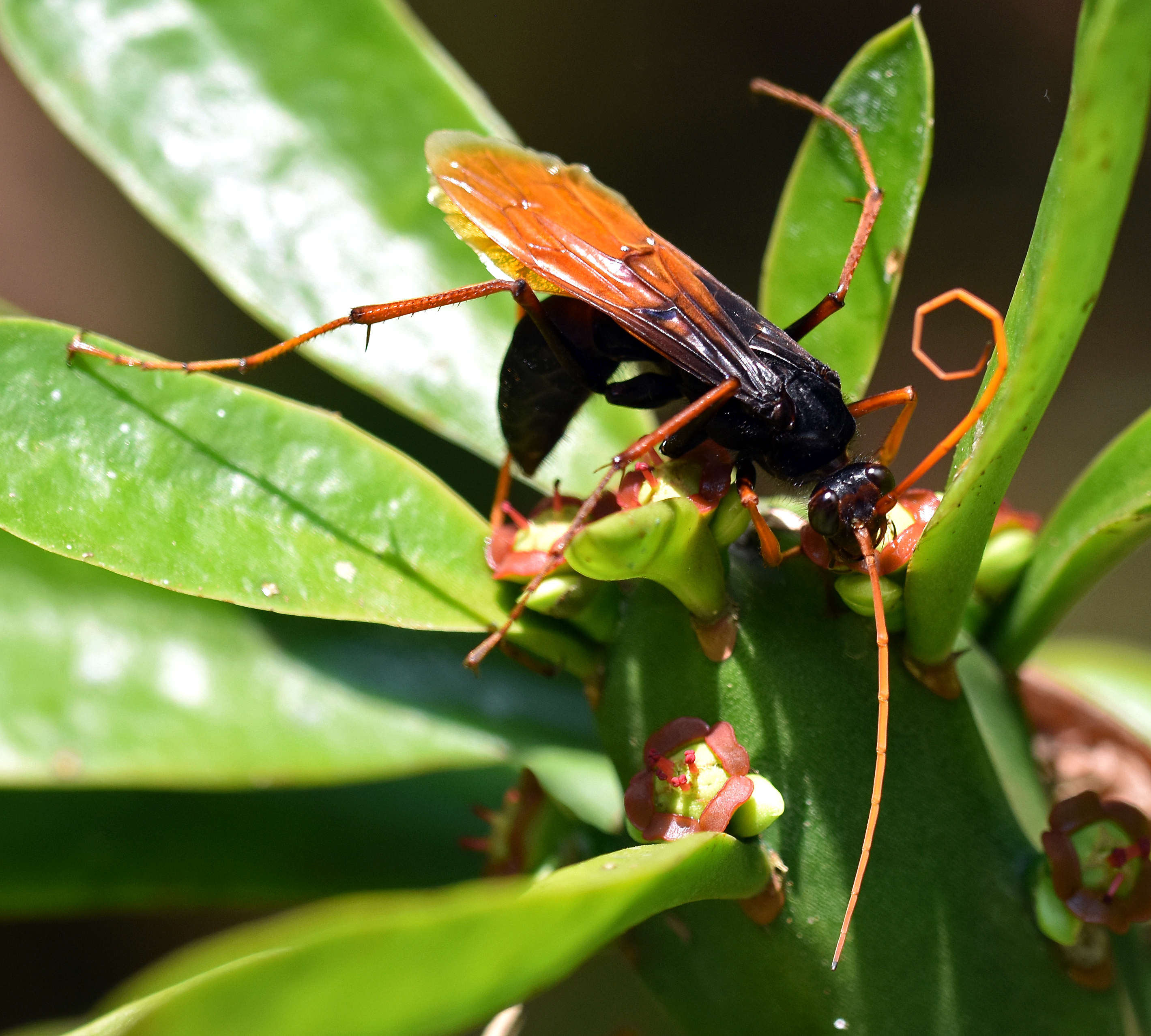 Here is a lovely spider wasp (below) with long, flexible antennae which it can clearly manipulate very well. These pompilid wasps are spider killers!