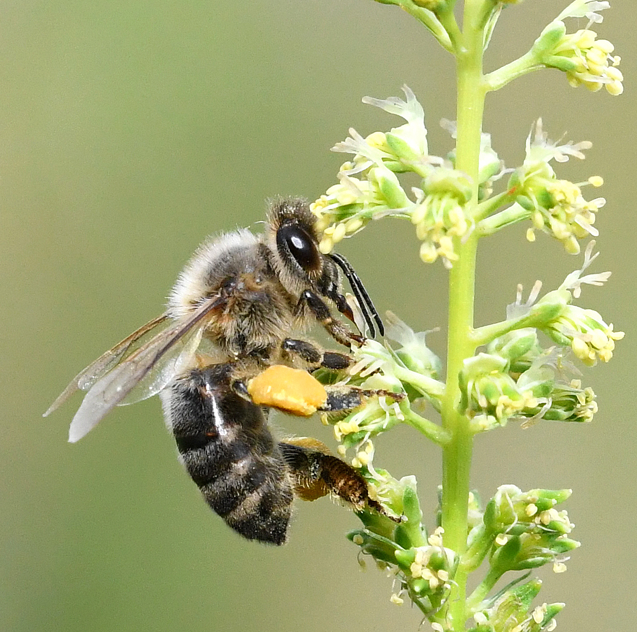 Apparently, the antennae of bees droop downwards, and stop moving, when they sleep! I only have one picture of a sleeping (or at least resting!) bee (below) and the antennae don’t seem to have dropped, or drooped very much! A bit. Perhaps it was just dozing; worn out by carrying around such large pollen sacs!