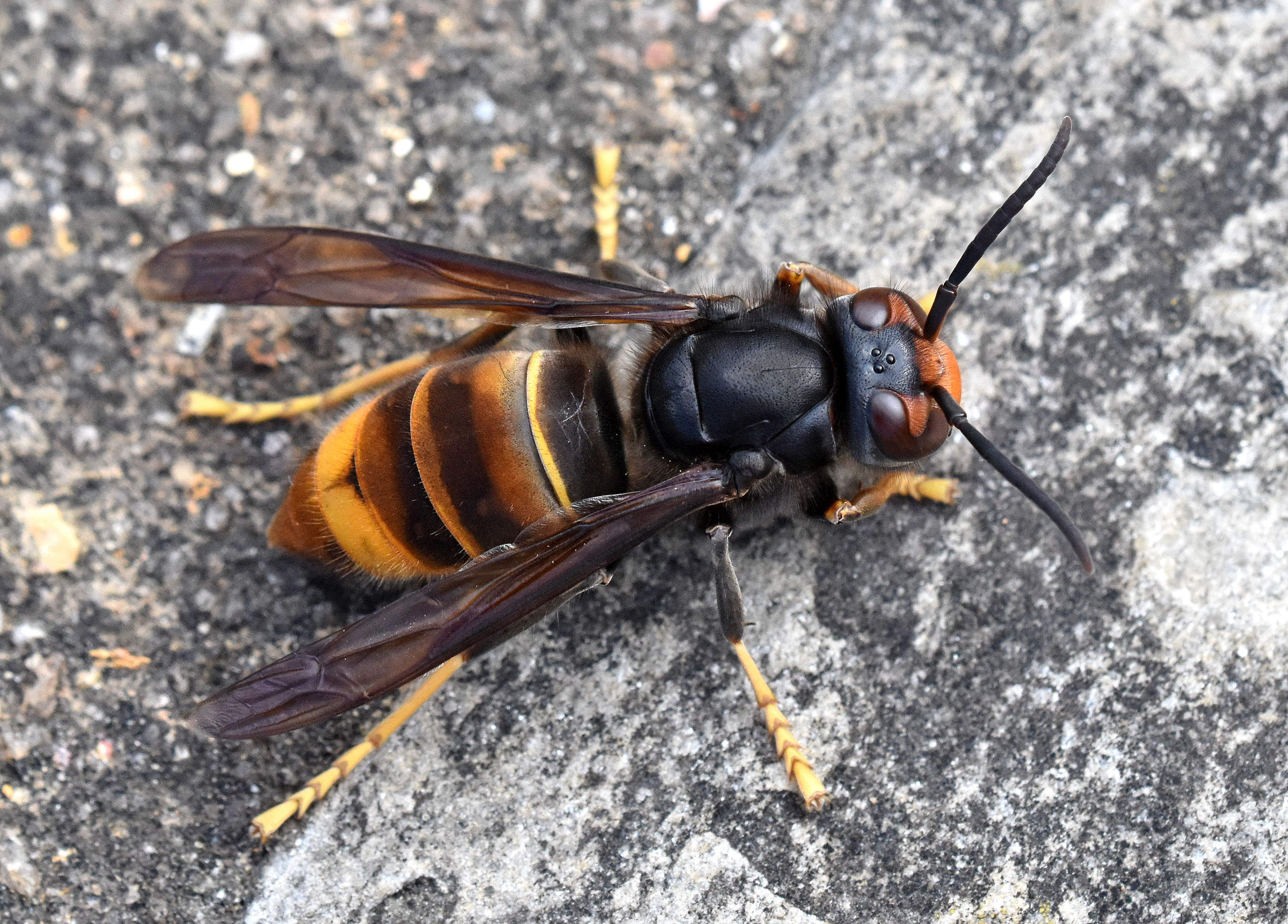 Hymenoptera, wasps in particular – like the fabulous Asian giant hornet (Vespa mandarinia) (above) – are a group where the antennae often play an important role during courtship and mating, with the male drumming, stroking or grabbing the female’s body or antennae! Here (below) is another invasive hornet, the Asian hornet (Vespa velutina), which I photographed in Spain. The males’ antennae are longer than those of the female, but you would need the two side by side to compare them. The antennae are large and robust and no doubt highly sensitive to a range of chemicals and pheromones. This wasp raises up its antennae and front legs and shakes its wings when it feels threatened. That’s the time to run! Incidentally, the so-called ‘murder hornet’, Vespa mandarinia (above) hunts the Asian hornet, V. velutina (below)! (Kwon and Choi, 2020).