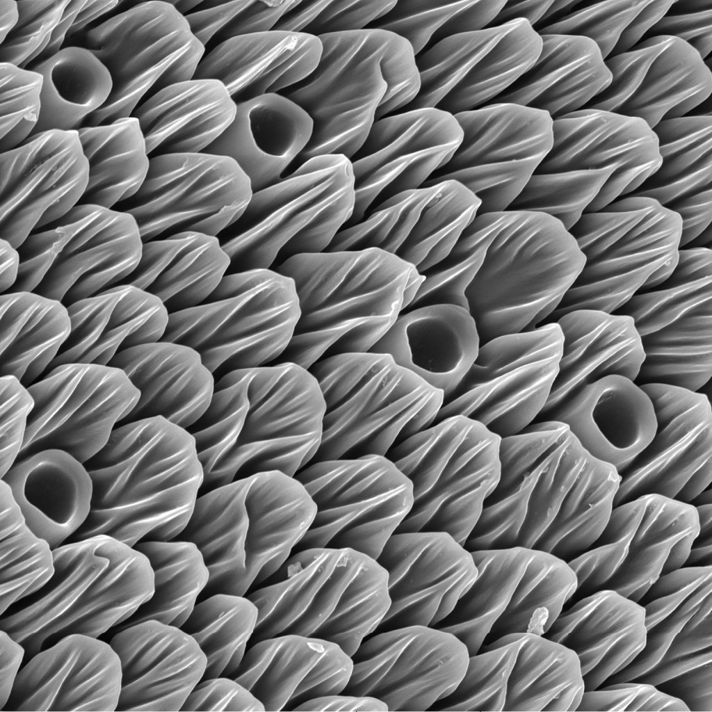 Scientists have given these microscopic sensillae a variety of different names, based on their shapes, like: trichoid, leaflike, campaniform, coeloconic, basiconic, placoid and so on. They come in all shapes and sizes and are there are different receptors for evaluating different things; olfactory sensilla (smells), gustatory sensilla (tastes), mechanosensilla (movements), hygro- (water) and thermosensilla (temperature). The electron micrograph of olfactory receptors (scales and holes) on the antenna of the peacock butterfly, is particularly beautiful I think (below).