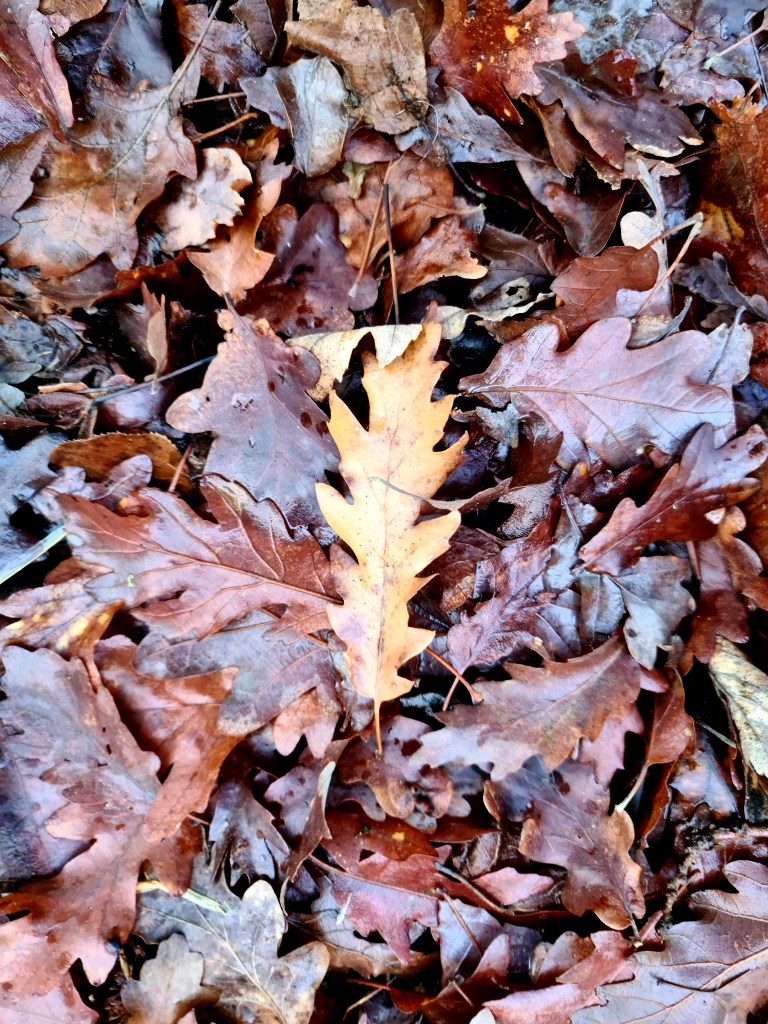 A leaf, blown here and there on windy days, finally comes to rest on the trunk of a tree. It’s tree, or another one?