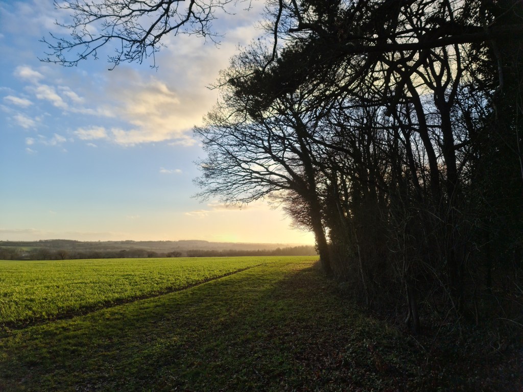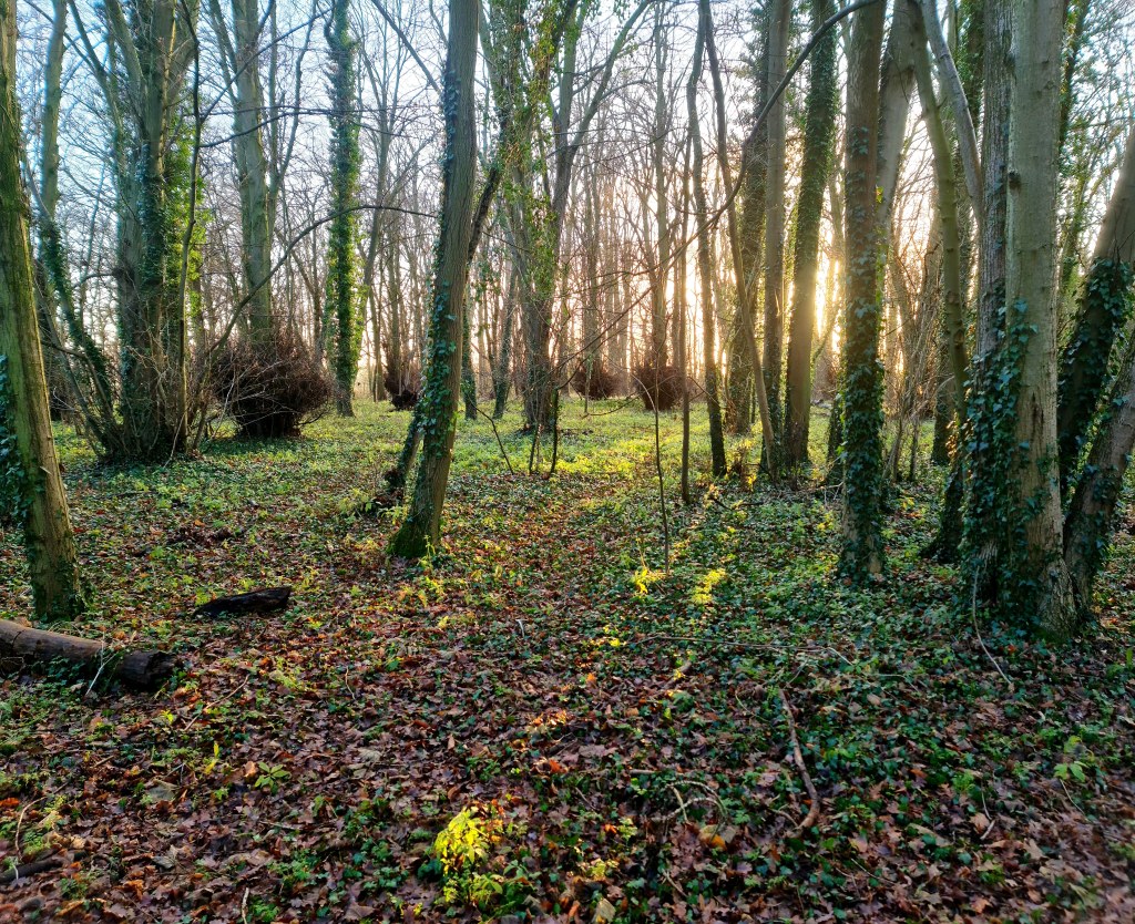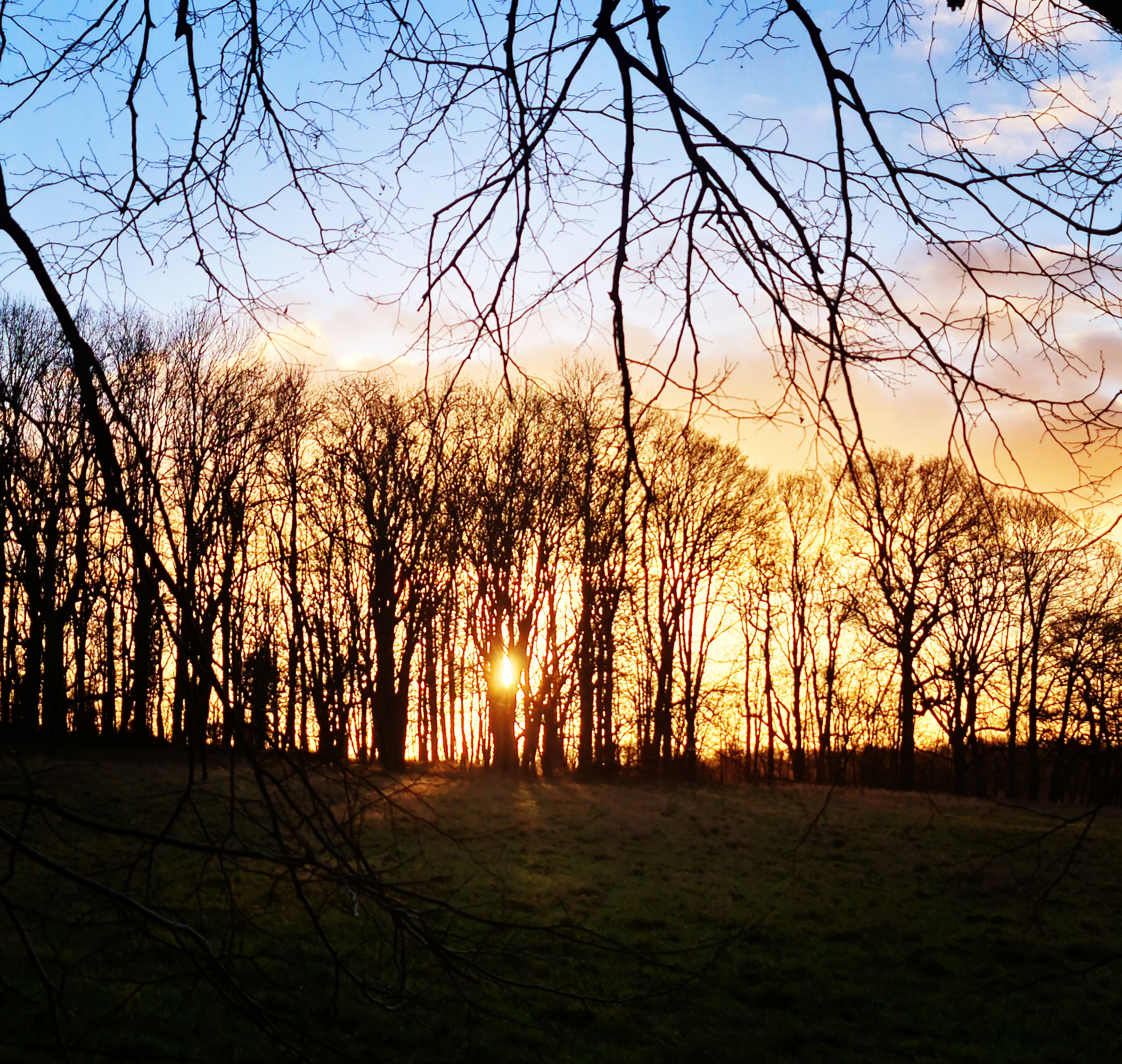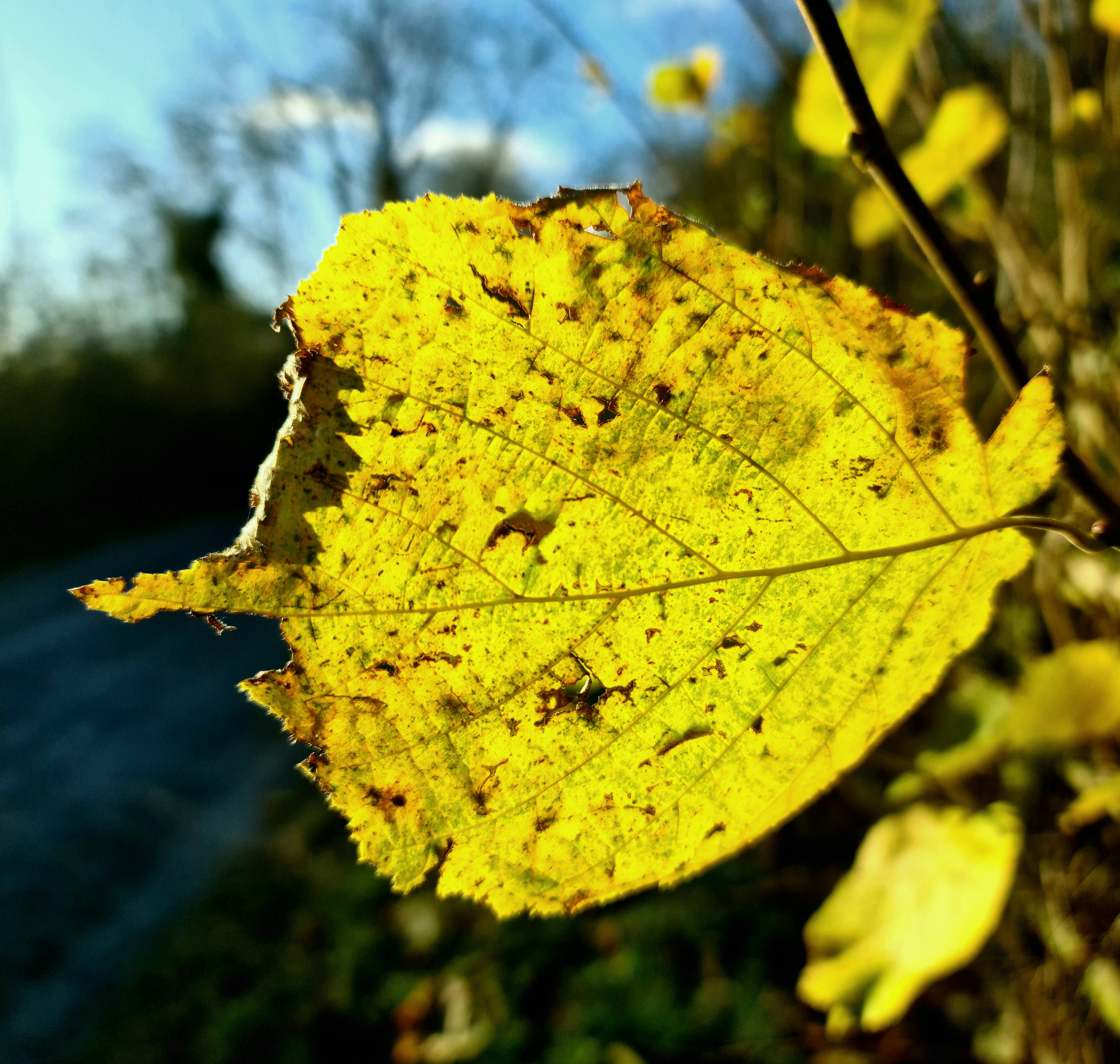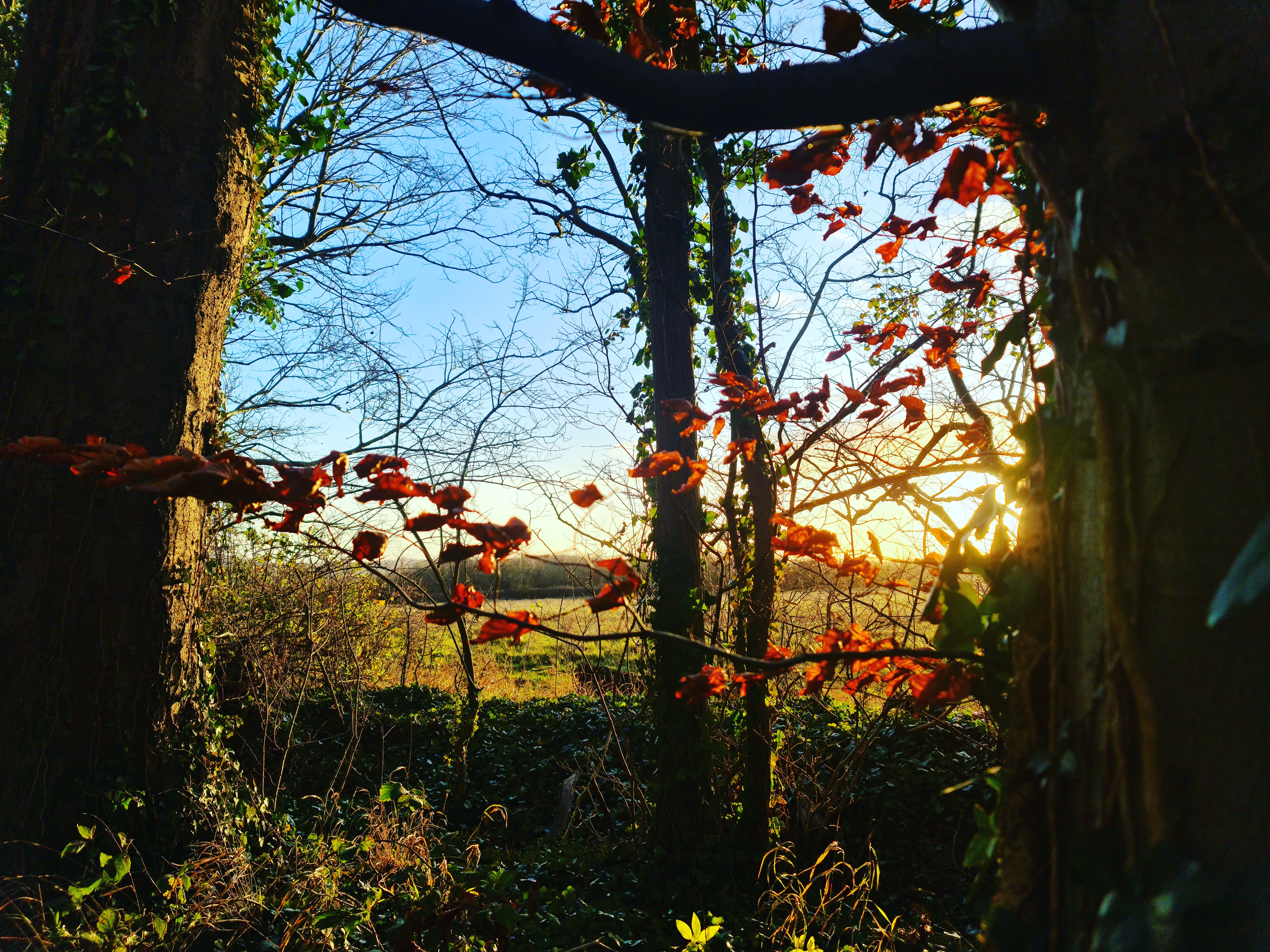 I like the rich colours of the setting sun. Everything, even a few old leaves, looks magical in the fading light.