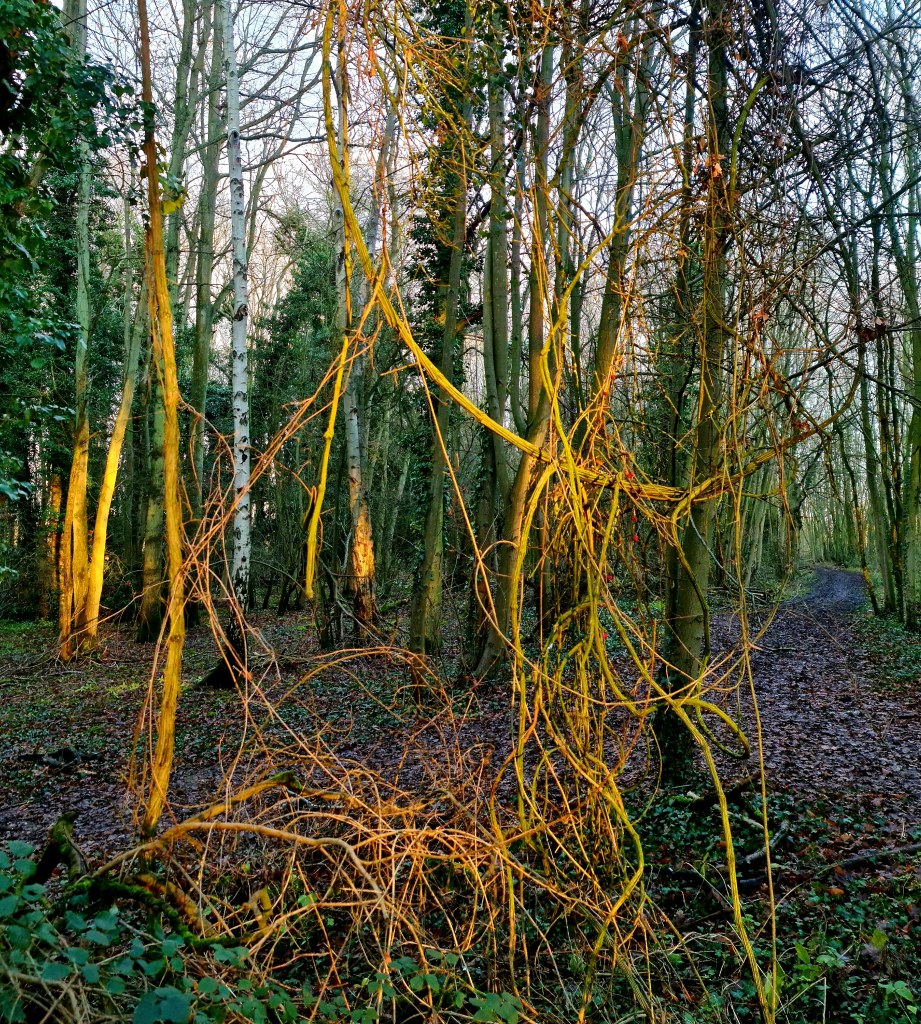 Ordinary things, like a tangled mass of stems and branches, are suddenly given a theatrical design by the fleeting rays of the setting sun.