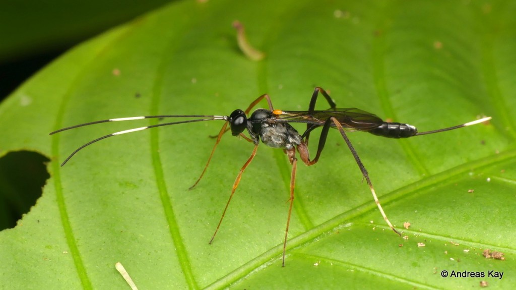 Here’s a fabulous video of one using its lovely legs/would be antennae to clean itself! The Ichneumon Wasp, Nonnus sp., shown below, has some lovely, genuine antennae, with white segments not unlike the legs of the stilt-legged flies above? Why do the wasps have these white segments? Is it for signalling as well?