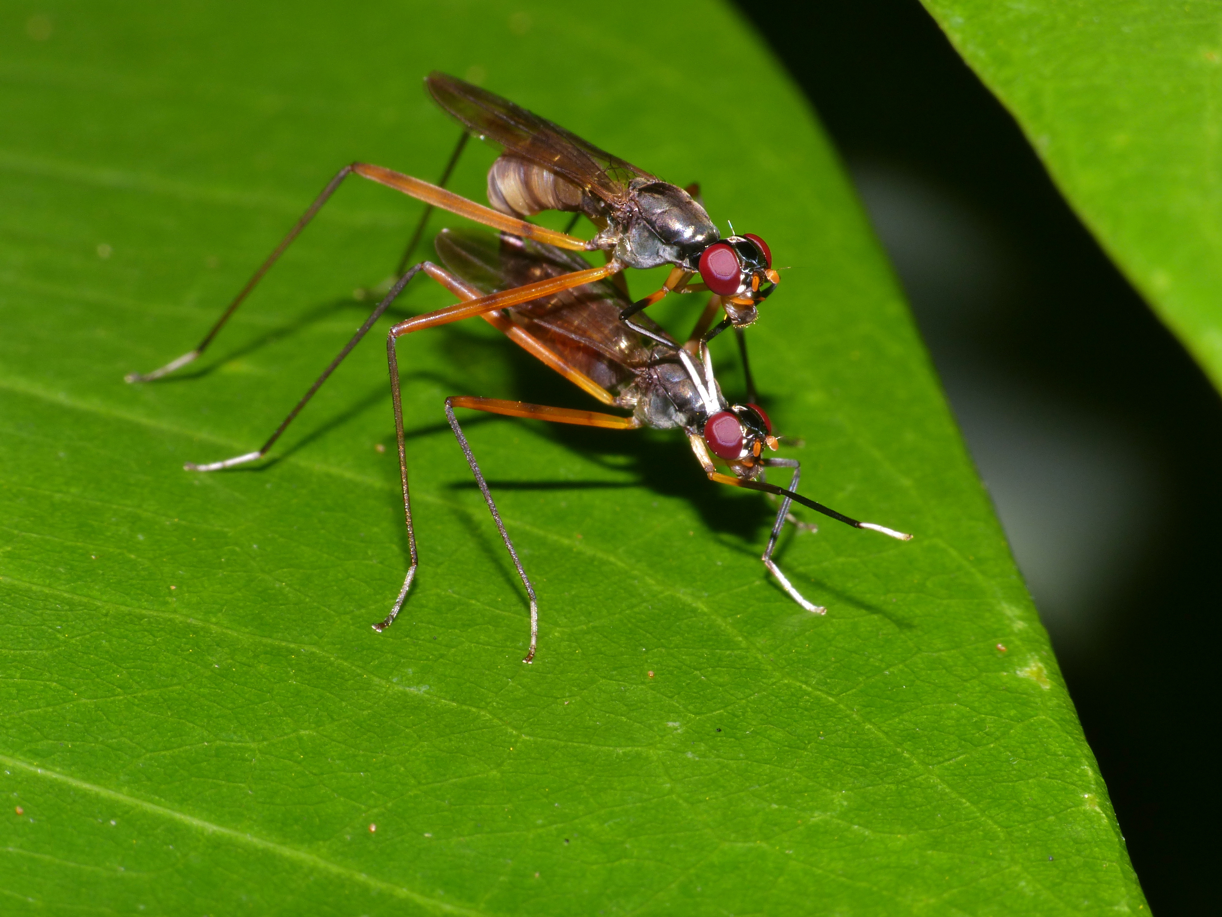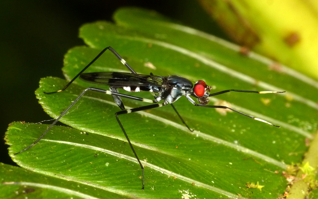 Stilt-legged flies (Micropezidae, Taeniapterinae) like the one shown below photographed by Andrea’s Kay, have a habit of standing motionless while waving their prominently marked front legs in front of their heads, a behaviour which is generally thought to be their mimicry of wasps. But are they mimicking wasps or displaying their lovely legs, or both? I think they use them for signalling, as shown here in this video. But perhaps they also fool a few other creatures into thinking they are wasps?