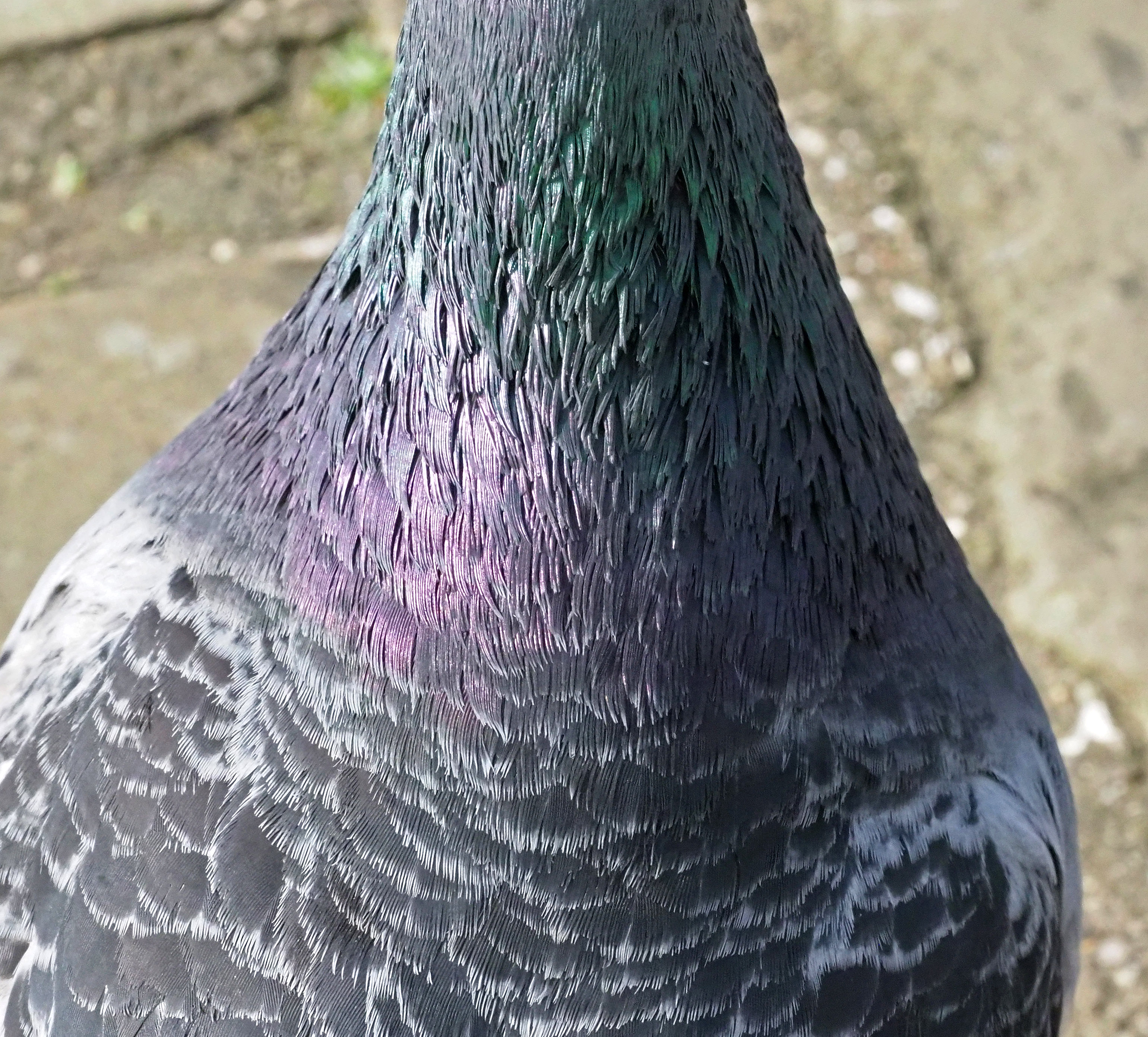 The iridescent feathers produce their wonderful green and purple colours by structural colouration, rather than by pigments. These sort of feathers (or scales in butterflies) are generally ‘costly’ to make – physiologically costly that is – in the animal kingdom, so there must be a good reason to have them; to have evolved them. The iridescent feathers on the neck are very different from the other feathers on the body of the bird.