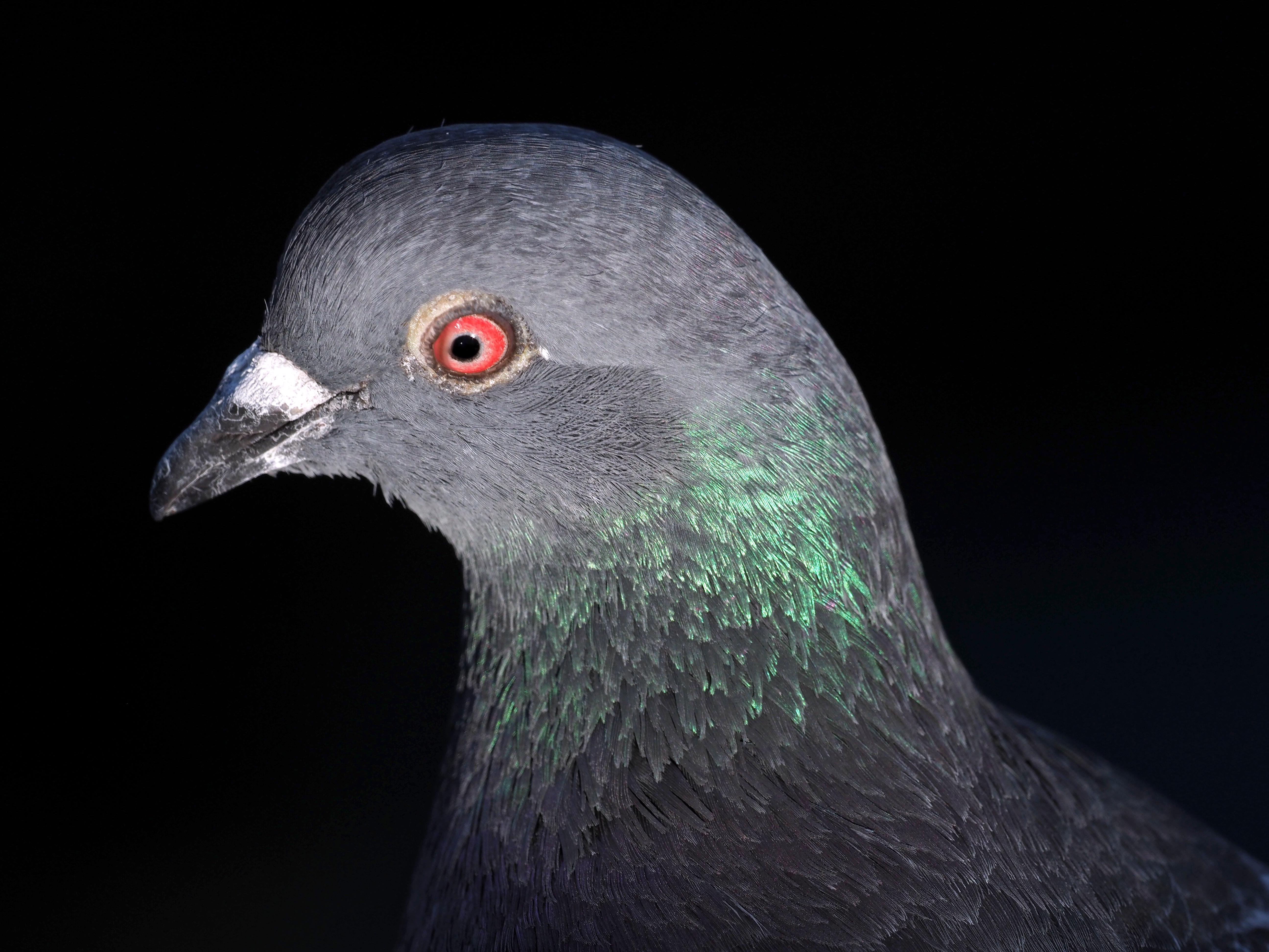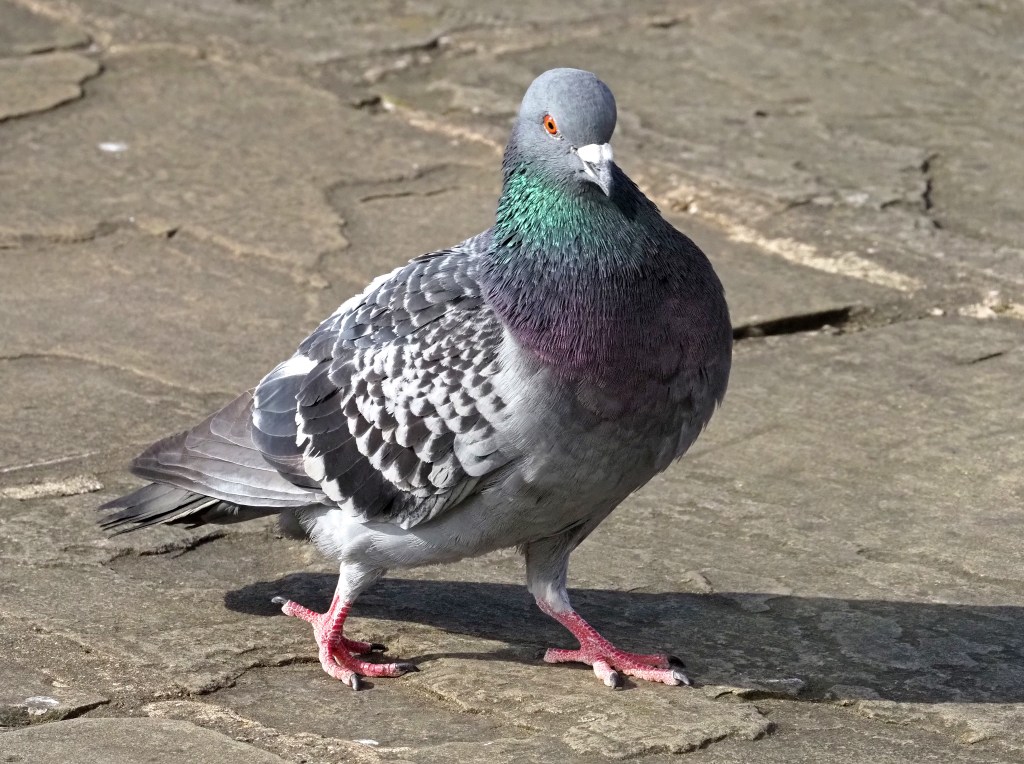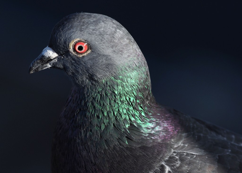 The conventional explanation, is that structural colours like this tell the birds something about their quality. A showy feature, like the peacock’s tail, which the females use to select the most attractive male. But both sexes have these iridescent feathers, to some extent in pigeons, so what does it tell them about each other?