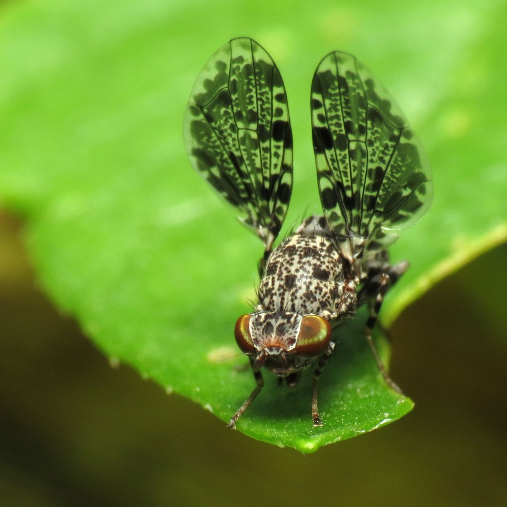 The wings of the Peacock flies are densely patterned: almost completely filled with dark dots (see below). Callopistromyia annulipes is rather unique in that it holds its wings in a perpendicular to its body and opens and spreads them whilst shuffling back and forth at the same time (see Videos below). The wings form “striking patchworked, iridescent-fans, which are moved in an arrhythmic jerking motion as the flies periodically run to and fro” (Archer & Hosken, 2016). Both males and females do it; perhaps in a courtship which allows for mutual mate choice.