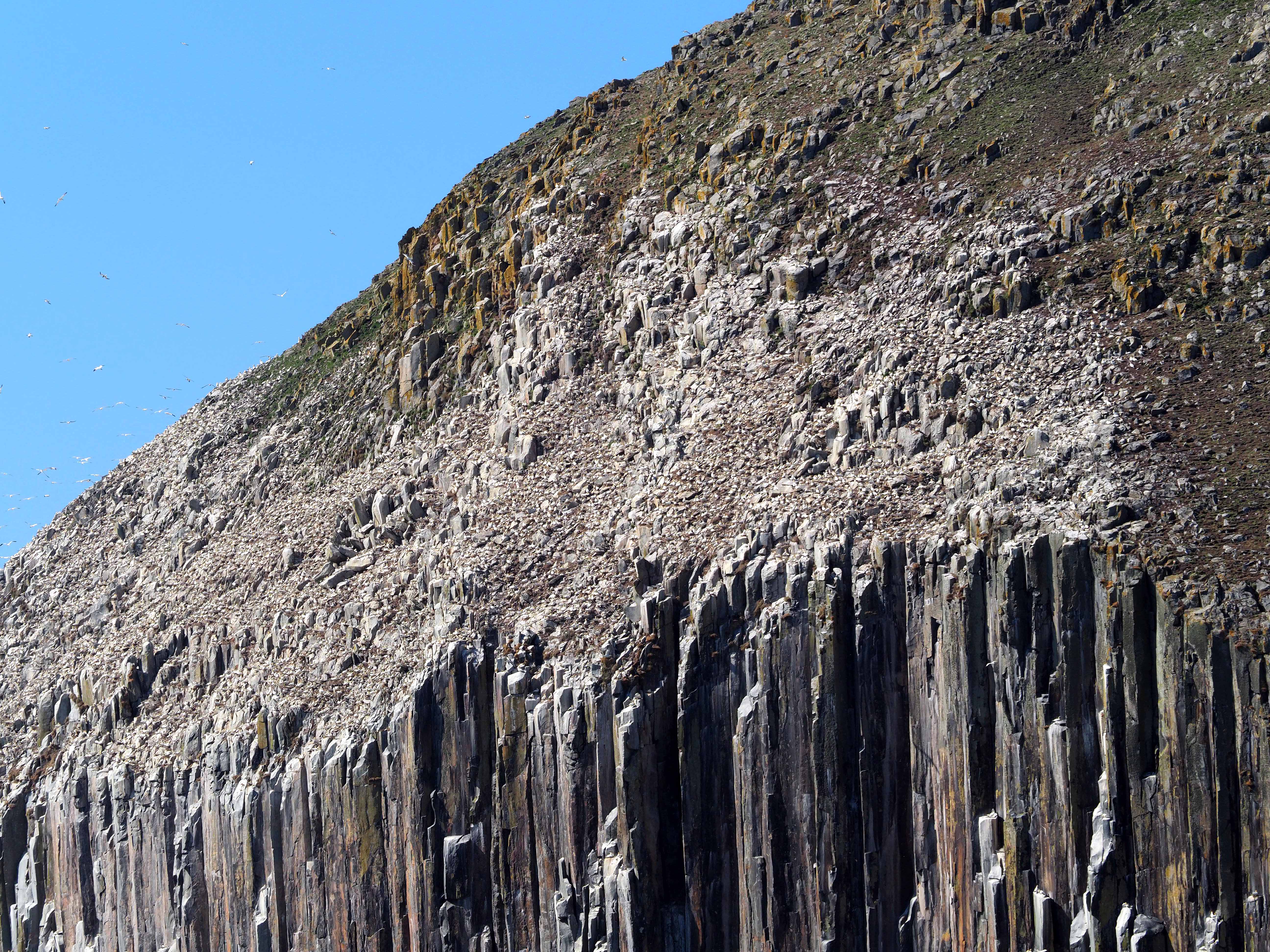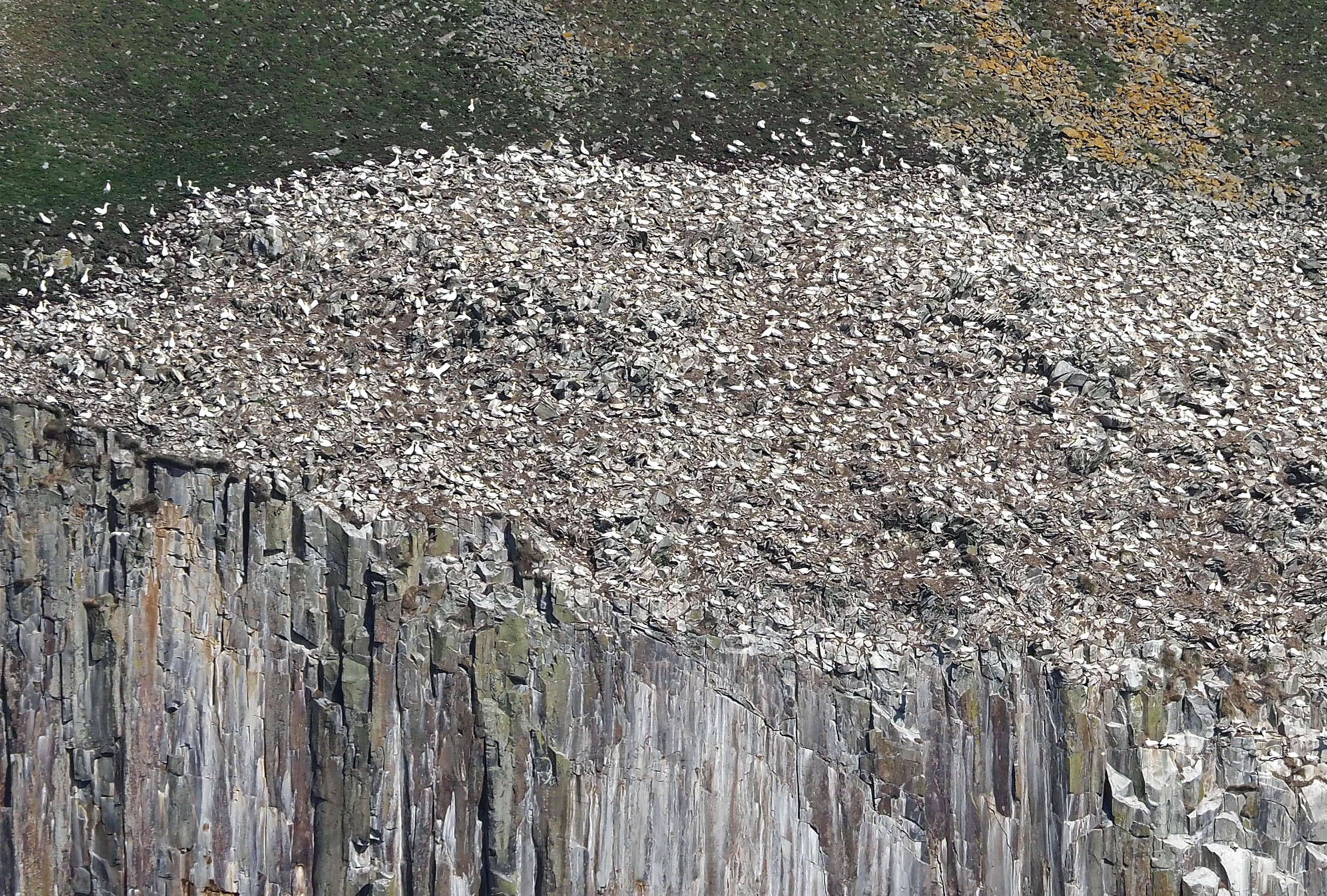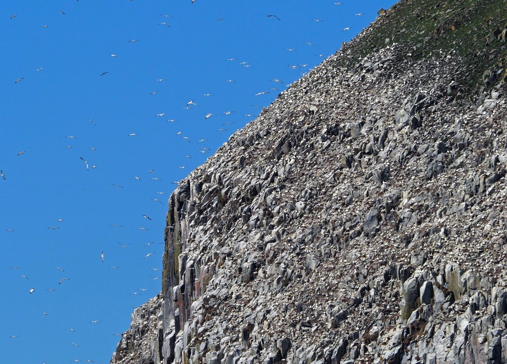 At one point, the Gannets seemed to come tumbling off the cliffs in waves. Thousands flowing down the sides of the island like water. What was driving them off? A Skua?