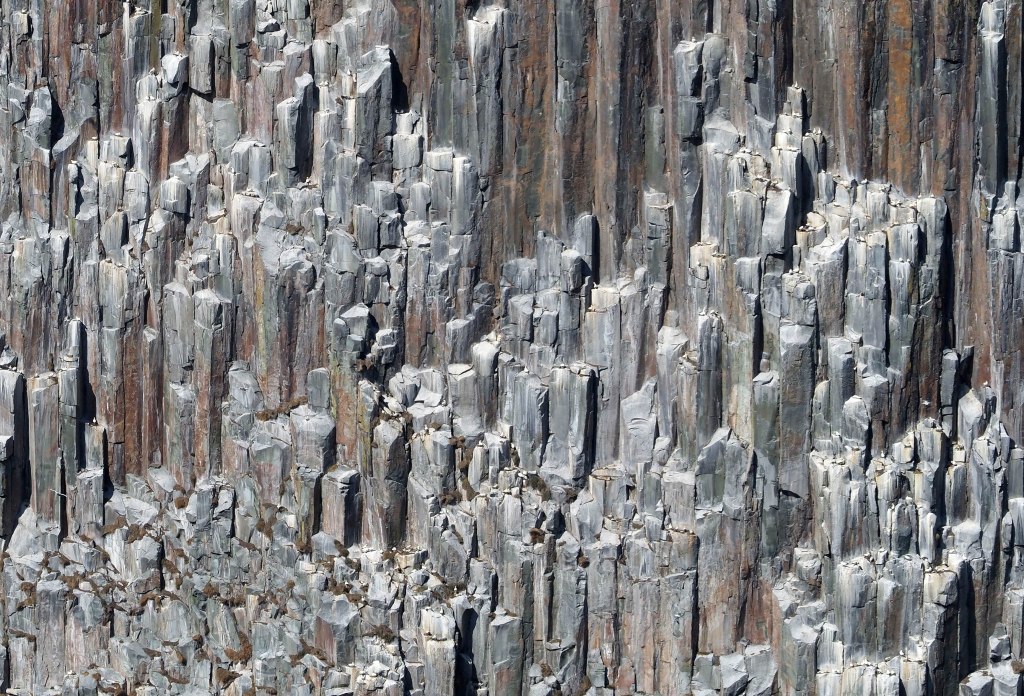 The columnar structures in the microgranites of Ailsa Craig (above) are not to be confused with the basalt columns seen at Fingal’s Cave on the island of Staffa (see below), in the Inner Hebrides of Scotland, which are a cooling-induced joint pattern (Harrison et al., 1987).  Cooling of the solidified lava at the Giant’s Causeway in Northern Ireland and at Fingal’s cave resulted in contraction and fracturing, which produced the regular hexagonal fracture.
