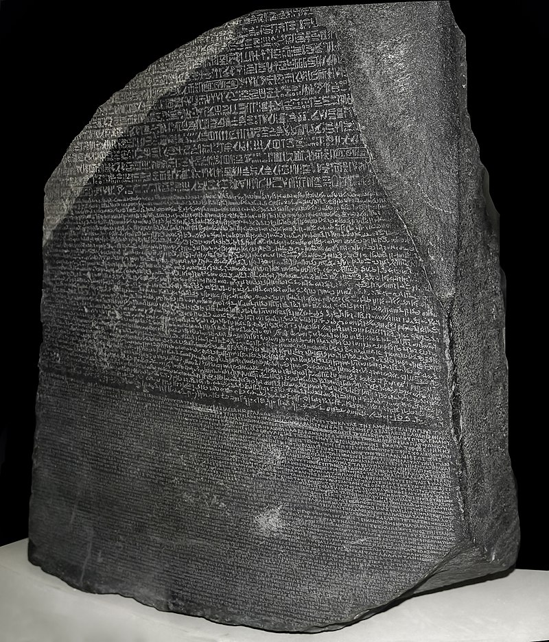 The Rosetta Stone. Image treated, from file https://commons.wikimedia.org/wiki/File:Rosetta_Stone.JPG]