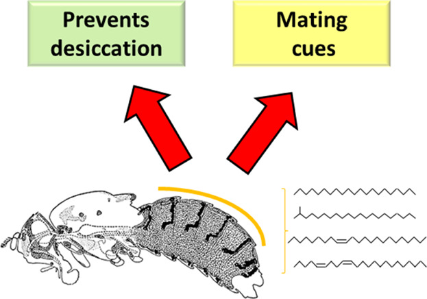 Cuticular hydrocarbons (CHCs) play two critical roles in insects. They form a waxy layer on the cuticles of insects to prevent desiccation due to cuticular water loss (Chung & Carroll, 2015).