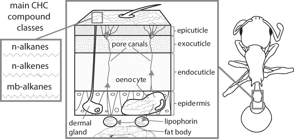 Cross-section through the integument of an insect highlighting CHC transport pathways and their deposition on the epicuticle, left: examples of the three most commonly occurring CHC compound classes n-alkanes, n-alkenes, and methyl-branched alkanes. From Holze et al. (2020)