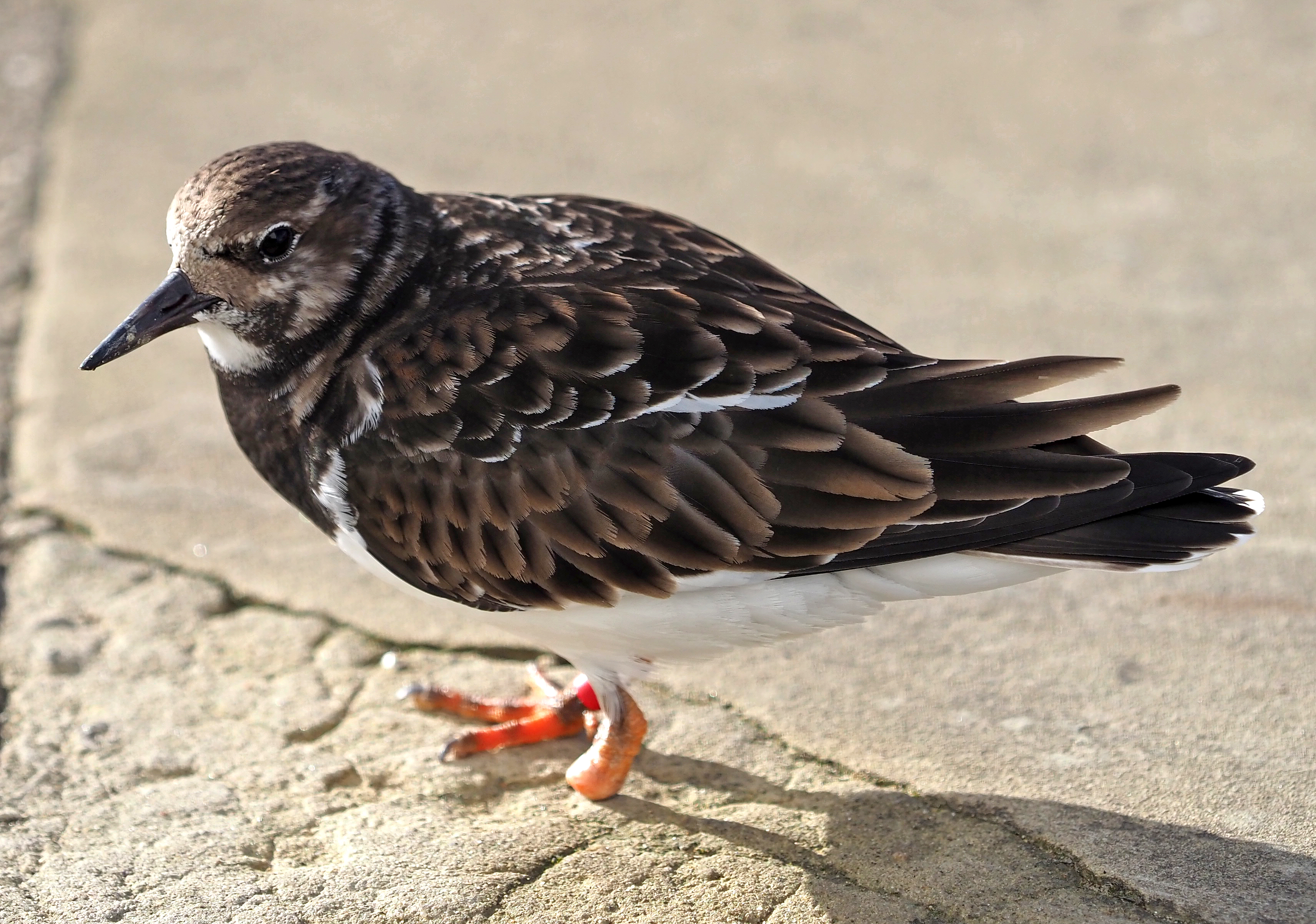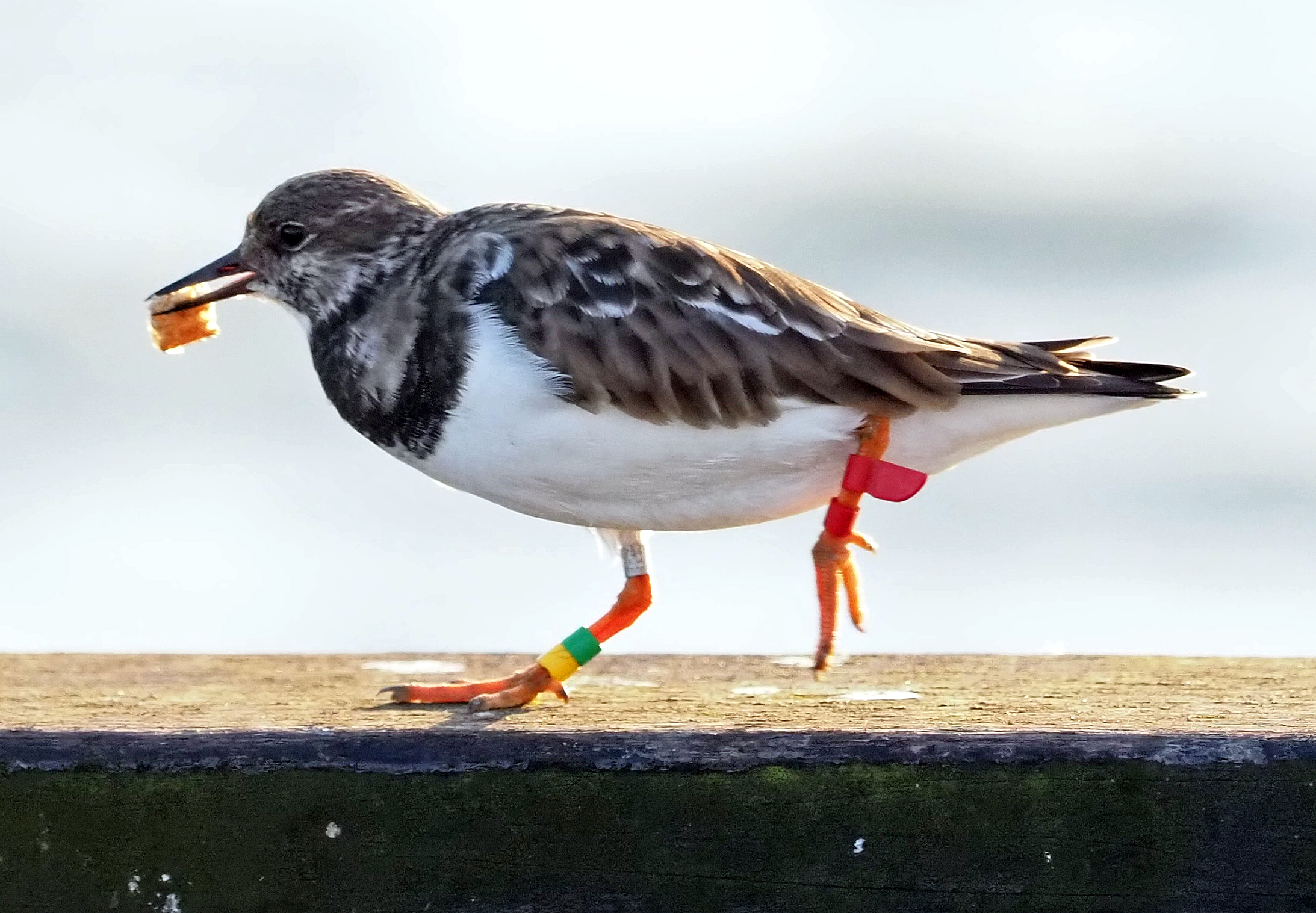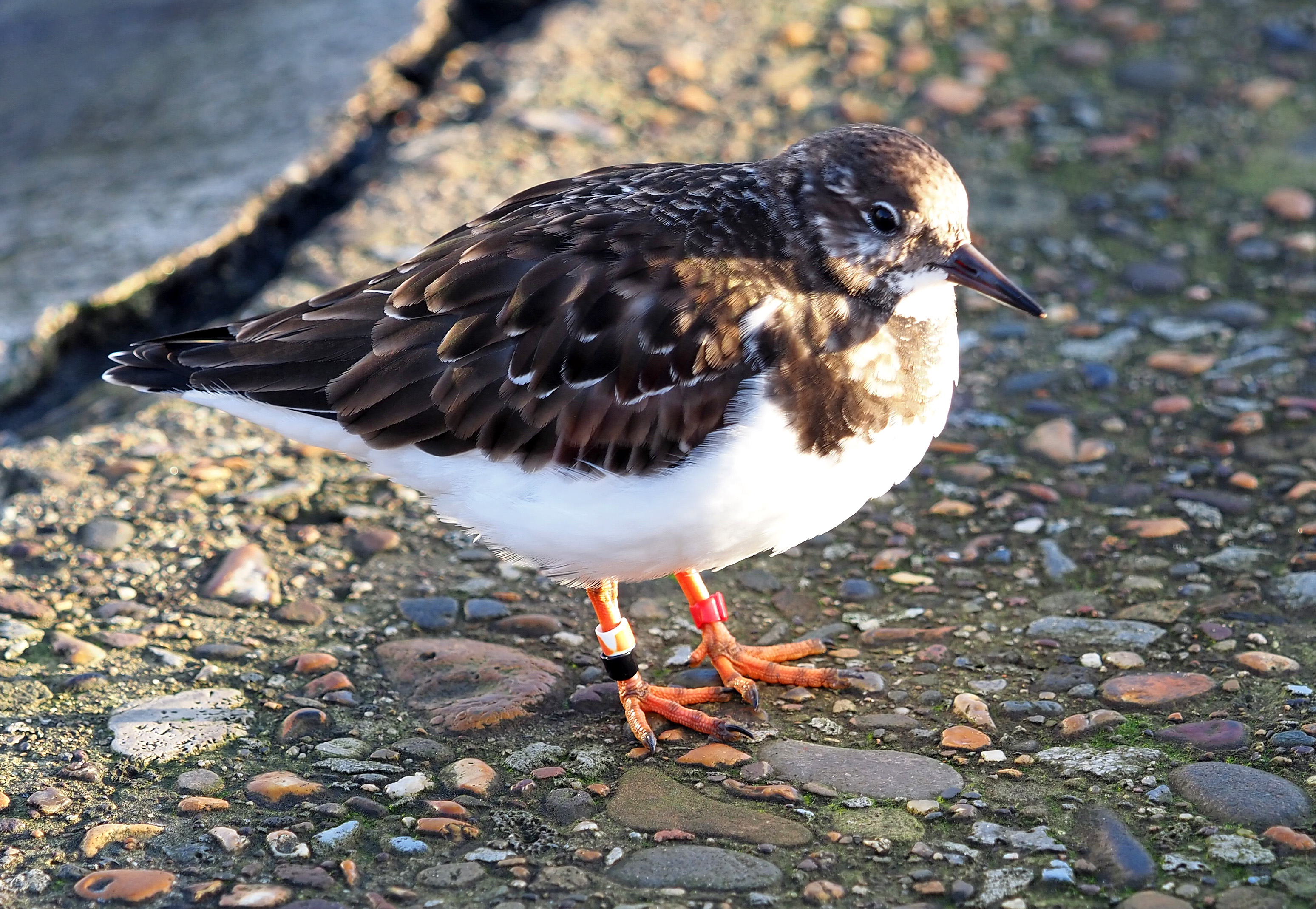 Although they presumably have no trouble in recognising each other, it think it is almost impossible for humans to spot individuals in non-breeding plumage. That is why people have ringed them in the past (below). A very handy way to recognise each bird, although whether the turnstones like their plastic bracelets is harder to say!