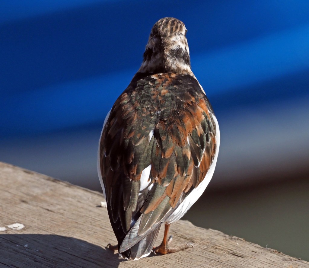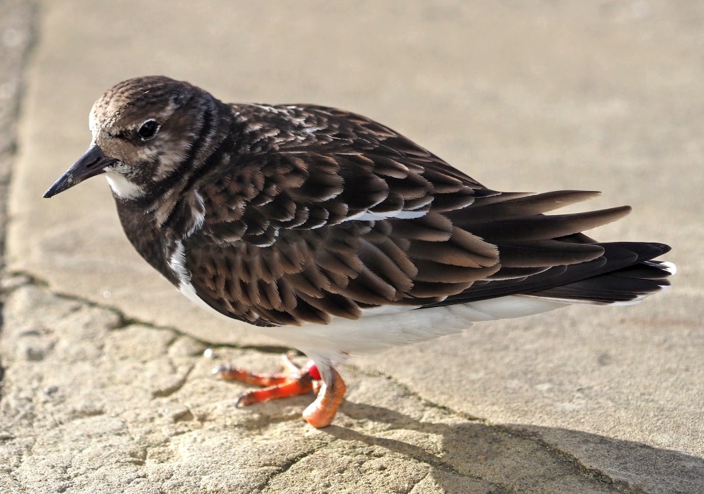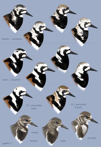 Ruddy turnstones are a bit different from some other types of waders, in that they have individual markings. Wintering turnstones have individually variable plumage which remains the same from year to year. This enables the birds to be recognized by their neighbours (Whitfield, 1986). This means that they are rather variable (see below). However, the variation seems to be much easier to tell apart when they are in breeding plumage.