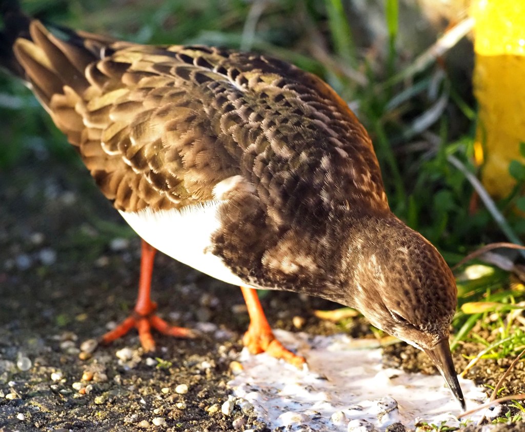 Almost all Turnstones wintering on the seaboard of western Europe are said to breed in Greenland and north-east Canada. It’s hard to believe that the little things you see around the harbour, fly all the way to Greenland and back! And they bring their new offspring with them! A few don’t make it back, but remarkably, their migration to and from the Arctic breeding grounds does not cause much mortality. More die hanging around their overwintering grounds apparently! Some seem to lose toes, unfortunately. Others live dangerously, scavenging for left-over chips or ice cream (see below) in the car park by the harbour! As I described in a previous blog.