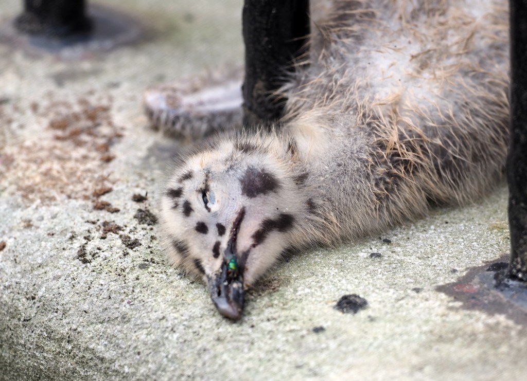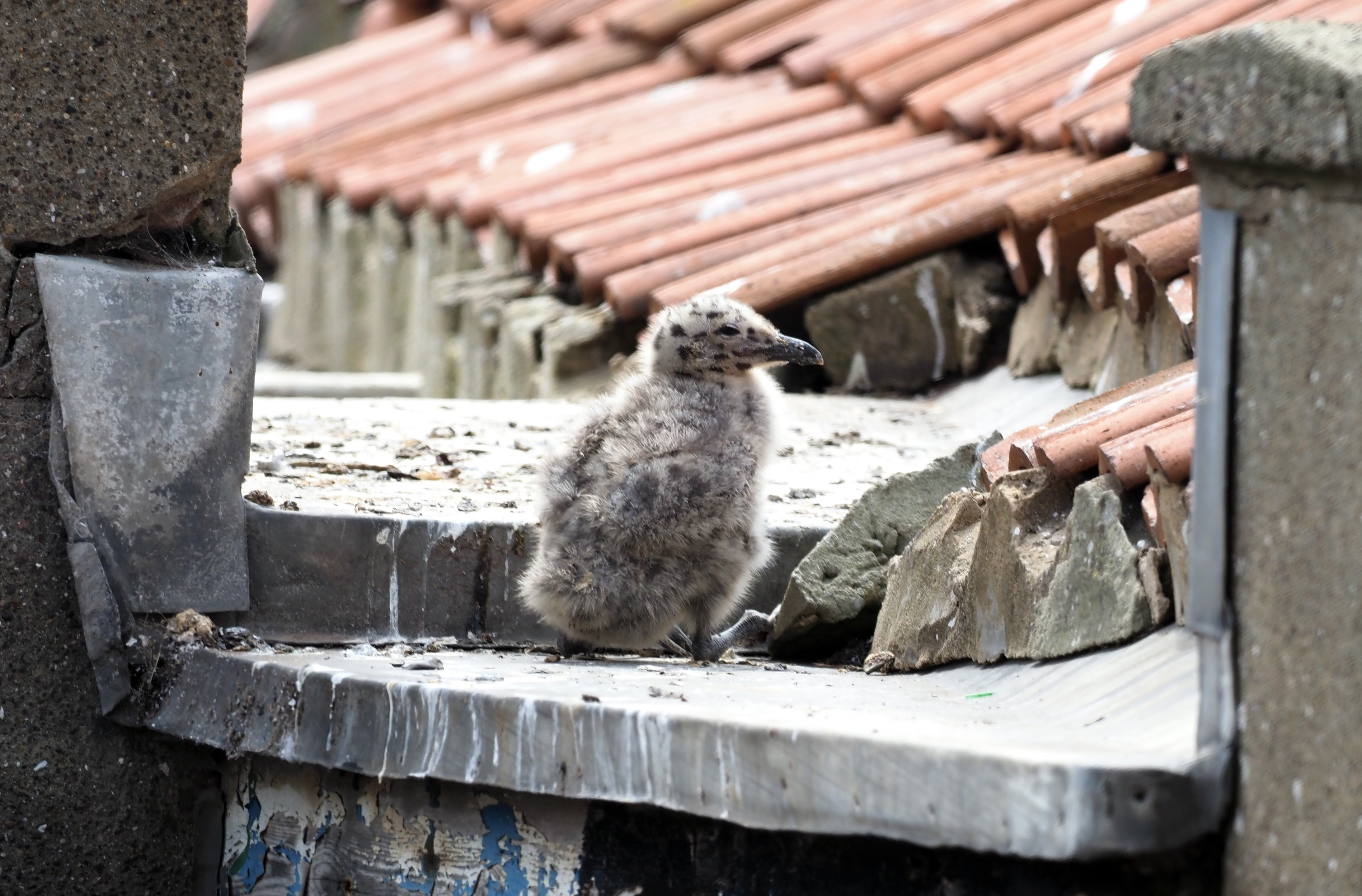 The casualty rate for roof-nesting Herring gulls seems to be quite high: many fall off (see below) and die, or wander around the streets being fed occasionally, we can assume, by the parents. A lot of these ones also get run over by cars.